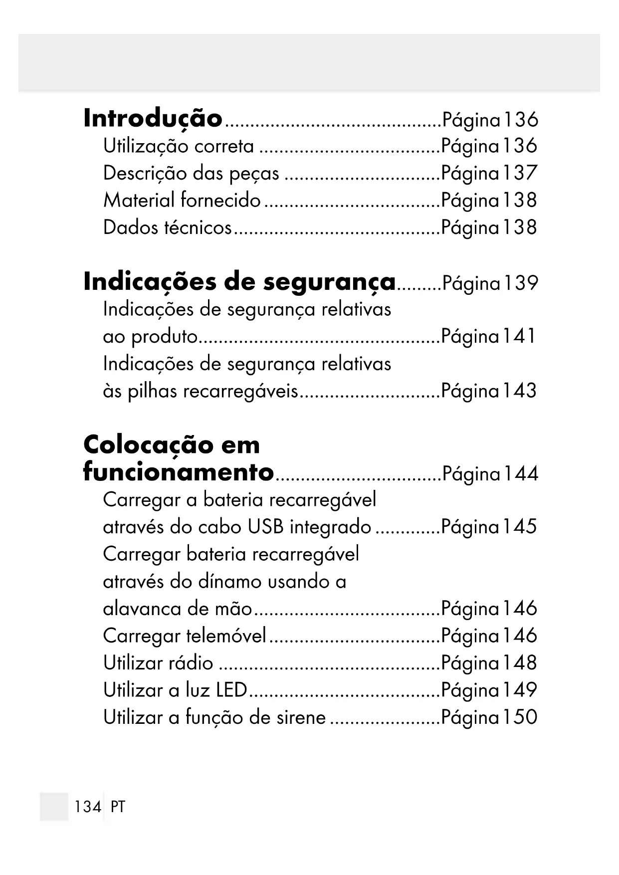 MANUAL DE INSTRUÇÕES! SE TRANSMITIR O ARTIGO A TERCEIROS, ENTREGUE TAMBÉM OS RESPETIVOS DOCUMENTOS. Este produto pode ser utilizado por crianças a partir dos 8 anos, assim como por pessoas com capacidades140 PT físicas, sensoriais ou mentais reduzidas ou defi- ciências na experiência e conhecimento, se forem vigiadas ou instruídas em relação ao uso seguro do produto e se compreenderem os perigos que possam resultar. As crianças não devem brincar com o produto. A limpeza e a manutenção pelo utilizador não devem ser realizadas por crianças sem vigilância. Não utilize o produto, se detetar qualquer dano. Não opere o produto perto de fontes de calor como radiadores ou outros aparelhos que produ- zem calor. A bateria não deve ser exposta a calor forte, como, por exemplo, radiação solar, fogo ou similares. Este produto apenas pode ser utilizado em climas moderadamente temperados; o produto não é apropriado para ser utilizado em países com clima tropical. Durante o carregamento, o produto pode aque- cer. Ao carregar-lo, coloque o em um lugar com boa ventilação e não cubra o aparelho. Somente carregue a bateria em um ambiente seco. Proteja o produto contra água e humidade.141 PT Nunca mergulhe o aparelho em água ou outros líquidos! Veja o manual de instruções do aparelho de carregamento. Não abra o produto e não modifique o produto. Este produto não possui quaisquer peças que pos- sam obter manutenção por parte do consumidor. Indicações de segurança relativas ao produto Sempre desdobre completamente a alavanca de mão. Para melhorar o tempo de duração da bateria e as peças mecânicas, esteja atento aos seguintes pontos: – Não gire a alavanca de mão por mais de 5 minutos enquanto o produto estiver carregando. O produto se encontra então na operação normal. – Quando a luz ficar fraca e o rádio não funcionar mais, a bateria não está carregada o suficiente. Neste caso, desligue a luz e o rádio e gire a alavanca de mão.142 PT – Gire a alavanca o mais constante possível (o carregamento funciona melhor com giros de 2 ½ – 3 giros por segundo). Evite giarar rá- pido demais ou um troca abrupta da direção do giro. Um giro vagaroso demais da alavanca pode influenciar a eficiência de carregamento do gerador e um giro rápido demais da alavanca pode danificar o mecanismo ou a alavanca. – No caso de uma função perfeita do produto, encerre o giro da alavanca após 5 minutos. – Se não utilizar o produto, acione a alavanca no mínimo uma vez por mês por no mínimo um minuto para prolongar a eficiência da bateria. Desligue o produto através do interruptor de LIGAR / DESLIGAR quando não usar o produto por um tempo prolongado. Não exponha o produto a temperaturas extre- mas e proteja-o contra impactos. Não deixe o produto cair. Não limpe o produto com detergentes agressivos ou ácidos e não utilize materiais duros. Desligue a luz e o rádio durante o carregamento para aumentar a capacidade do gerador. O143 PT interruptor de LIGAR /DESLIGAR precisa estar na posição ON. O produto pode ficar quente durante o carrega- mento. Isto é normal. Indicações de segurança relativas às pilhas recarregáveis