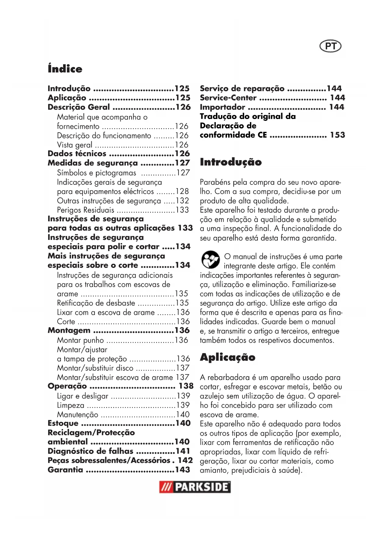 - Introdução Parabéns pela compra do seu novo apare- lho. Com a sua compra, decidiu-se por um produto de alta qualidade. Este aparelho foi testado durante a produ- ção em relação à qualidade e submetido a uma inspeção nal. A funcionalidade do seu aparelho está desta forma garantida. O manual de instruções é uma parte integrante deste artigo. Ele contém indicações importantes referentes à seguran- ça, utilização e eliminação. Familiarize-se com todas as indicações de utilização e de segurança do artigo. Utilize este artigo da forma que é descrita e apenas para as na- lidades indicadas. Guarde bem o manual e, se transmitir o artigo a terceiros, entregue também todos os respetivos documentos. Aplicação A rebarbadora é um aparelho usado para cortar, esfregar e escovar metais, betão ou azulejo sem utilização de água. O aparel- ho foi concebido para ser utilizado com escova de arame. Este aparelho não é adequado para todos os outros tipos de aplicação (por exemplo, lixar com ferramentas de reticação não apropriadas, lixar com líquido de refri- geração, lixar ou cortar materiais, como amianto, prejudiciais à saúde). Serviço de reparação p. 144