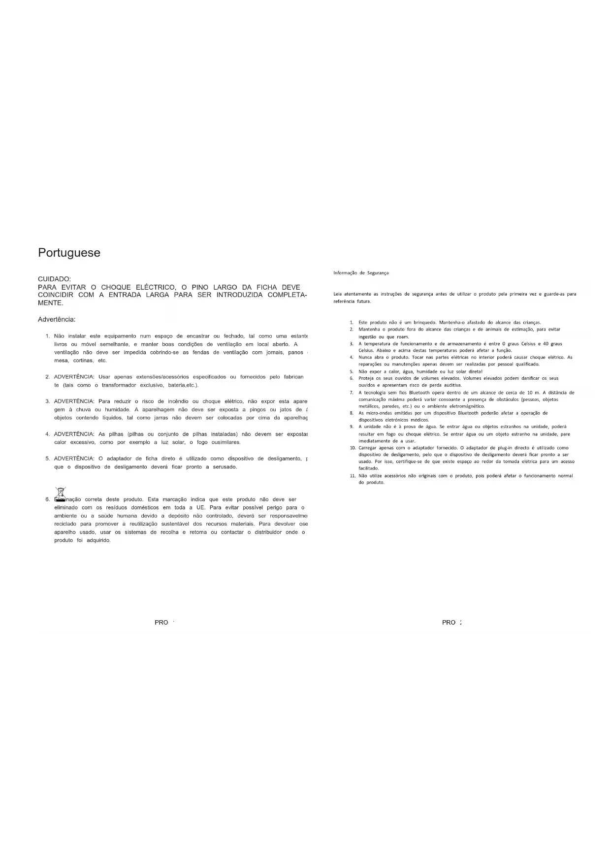 eliminado com os resíduos domésticos em toda a UE. Para evitar possível perigo para o ambiente ou a saúde humana devido a depósito não controlado, deverá ser responsavelmente reciclado para promover a reutilização sustentável dos recursos materiais. Para devolver oseu aparelho usado, usar os sistemas de recolha e retoma ou contactar o distribuidor onde o produto foi adquirido. Informação de Segurança Leia atentamente as instruções de segurança antes de utilizar o produto pela primeira vez e guarde-as para referência futura.
