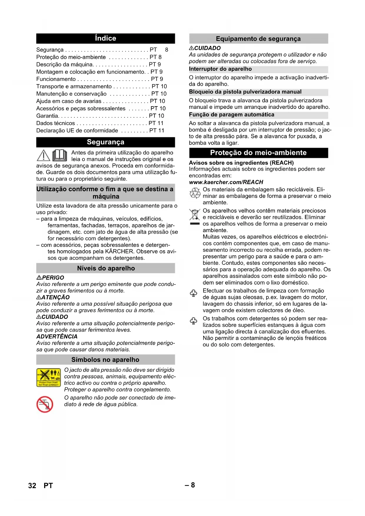 91 dB(A) Medidas y pesos Longitud 280 280 mm Anchura 176 242 mm Altura 443 783 mm Peso, listo para el funciona- miento con accesorios 4,7 5,6 5,8 kg Sujeto a modificaciones técnicas. Declaración UE de conformidad Producto: Limpiadora a alta presión Modelo: 1.673-xxx Directivas comunitarias aplicables 2000/14/CE 2014/30/UE 2006/42/CE (+2009/127/CE) 2011/65/UE Normas armonizadas aplicadas EN 50581 EN 55014–1: 2006+A1: 2009+A2: 2011 EN 55014–2: 2015 EN 60335–1 EN 60335–2–79 EN 61000–3–2: 2014 EN 61000–3–3: 2013 EN 62233: 2008 Procedimiento de evaluación de la conformidad aplicado 2000/14/CE: Anexo V Nivel de potencia acústica dB(A) Medido: 89 Garantizado: 91 CEO Head of Approbation 31ES– 8 Antes da primeira utilização do aparelho leia o manual de instruções original e os avisos de segurança anexos. Proceda em conformida- de. Guarde os dois documentos para uma utilização fu- tura ou para o proprietário seguinte. Utilize esta lavadora de alta pressão unicamente para o uso privado: – para a limpeza de máquinas, veículos, edifícios, ferramentas, fachadas, terraços, aparelhos de jar- dinagem, etc. com jato de água de alta pressão (se for necessário com detergentes). – com acessórios, peças sobressalentes e detergen- tes homologados pela KÄRCHER. Observe os avi- sos que acompanham os detergentes. PERIGO Aviso referente a um perigo eminente que pode condu- zir a graves ferimentos ou à morte. 몇 ATENÇÃO Aviso referente a uma possível situação perigosa que pode conduzir a graves ferimentos ou à morte. 몇 CUIDADO Aviso referente a uma situação potencialmente perigo- sa que pode causar ferimentos leves. ADVERTÊNCIA Aviso referente a uma situação potencialmente perigo- sa que pode causar danos materiais. 몇 CUIDADO As unidades de segurança protegem o utilizador e não podem ser alteradas ou colocadas fora de serviço. O interruptor do aparelho impede a activação inadverti- da do aparelho. O bloqueio trava a alavanca da pistola pulverizadora manual e impede um arranque inadvertido do aparelho. Ao soltar a alavanca da pistola pulverizadora manual, a bomba é desligada por um interruptor de pressão; o jac- to de alta pressão pára. Se a alavanca for puxada, a bomba volta a ligar. Avisos sobre os ingredientes (REACH) Informações actuais sobre os ingredientes podem ser encontradas em: www.kaercher.com/REACH Índice Segurança . . . . . . . . . . . . . . . . . . . . . . . . . . . PT8 Proteção do meio-ambiente . . . . . . . . . . . . . PT 8 Descrição da máquina. . . . . . . . . . . . . . . . . . PT 9 Montagem e colocação em funcionamento. . PT 9 Funcionamento . . . . . . . . . . . . . . . . . . . . . . . PT 9 Transporte e armazenamento . . . . . . . . . . . . PT 10 Manutenção e conservação . . . . . . . . . . . . . PT 10 Ajuda em caso de avarias . . . . . . . . . . . . . . . PT 10 Acessórios e peças sobressalentes . . . . . . . PT 10 Garantia. . . . . . . . . . . . . . . . . . . . . . . . . . . . . PT 10 Dados técnicos . . . . . . . . . . . . . . . . . . . . . . . PT 11 Declaração UE de conformidade . . . . . . . . . PT 11 Segurança Utilização conforme o fim a que se destina a máquina Níveis do aparelho Símbolos no aparelho O jacto de alta pressão não deve ser dirigido contra pessoas, animais, equipamento eléc- trico activo ou contra o próprio aparelho. Proteger o aparelho contra congelamento. O aparelho não pode ser conectado de ime- diato à rede de água pública. Equipamento de segurança Interruptor do aparelho Bloqueio da pistola pulverizadora manual Função de paragem automática Proteção do meio-ambiente Os materiais da embalagem são recicláveis. Eli- minar as embalagens de forma a preservar o meio ambiente. Os aparelhos velhos contêm materiais preciosos e recicláveis e deverão ser reutilizados. Eliminar os aparelhos velhos de forma a preservar o meio ambiente. Muitas vezes, os aparelhos eléctricos e electróni- cos contém componentes que, em caso de manu- seamento incorrecto ou recolha errada, podem re- presentar um perigo para a saúde e para o am- biente. Contudo, estes componentes são neces- sários para a operação adequada do aparelho. Os aparelhos assinalados com este símbolo não po- dem ser eliminados com o lixo doméstico. Efectuar os trabalhos de limpeza com formação de águas sujas oleosas, p.ex. lavagem do motor, lavagem do chassis inferior, só em lugares de la- vagem onde existem colectores de óleo. Os trabalhos com detergentes só podem ser rea- lizados sobre superfícies estanques à água com uma ligação directa à canalização dos efluentes. Não permitir a contaminação de lençóis freáticos ou do solo com detergentes. 32 PT– 9 O volume de fornecimento do aparelho (conforme o modelo) é ilustrado na embalagem. Este manual de ins- truções descreve todas as opções possíveis. Ver figuras no lado do gráfico 1 Ligação de alta pressão 2 Interruptor do aparelho "0/OFF" / "I/ON" 3 Visto de armazenamento 4 Punho de transporte 5 Alça de transporte 6 Conexão de água com peneira incorporada 7 Mangueira de aspiração do detergente com filtro de detergente e tampa 8 Reservatório de detergente 9 Peça de acoplamento para ligação da água 10 Local de armazenamento para lança 11 Armazenamento para pistola pulverizadora manual 12 Cabo de ligação à rede com ficha de rede 13 Roda de transporte 14 Pistola pulverizadora manual 15 Bloqueio da pistola pulverizadora manual 16 Grampo para mangueira de alta pressão 17 Mangueira de alta pressão Ver figuras no lado do gráfico Figuras - Montar os componentes soltos na embalagem no aparelho, antes de proceder à colocação em fun- cionamento. Colocar o aparelho sobre uma superfície plana. Figuras - Retirar o grampo da pistola pulverizadora manual e colocar a mangueira de alta pressão na pistola pulverizadora manual. Pressionar o grampo até encaixar. Controlar a liga- ção segura, puxando pela mangueira de alta pres-