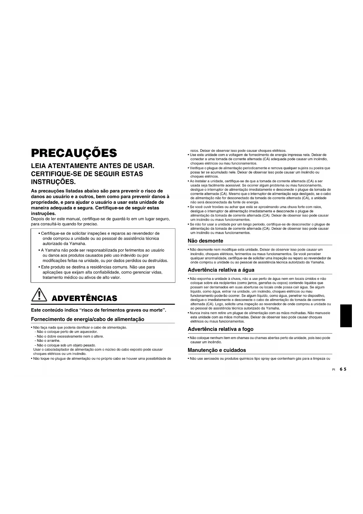- Não desmonte nem modifique esta unidade. Deixar de observar isso pode causar um incêndio, choques elétricos, ferimentos ou maus funcionamentos. Se você perceber qualquer anormalidade, certifique-se de solicitar uma inspeção ou reparo ao revendedor de onde comprou a unidade ou ao pessoal de assistência técnica autorizado da Yamaha. Advertência relativa a água