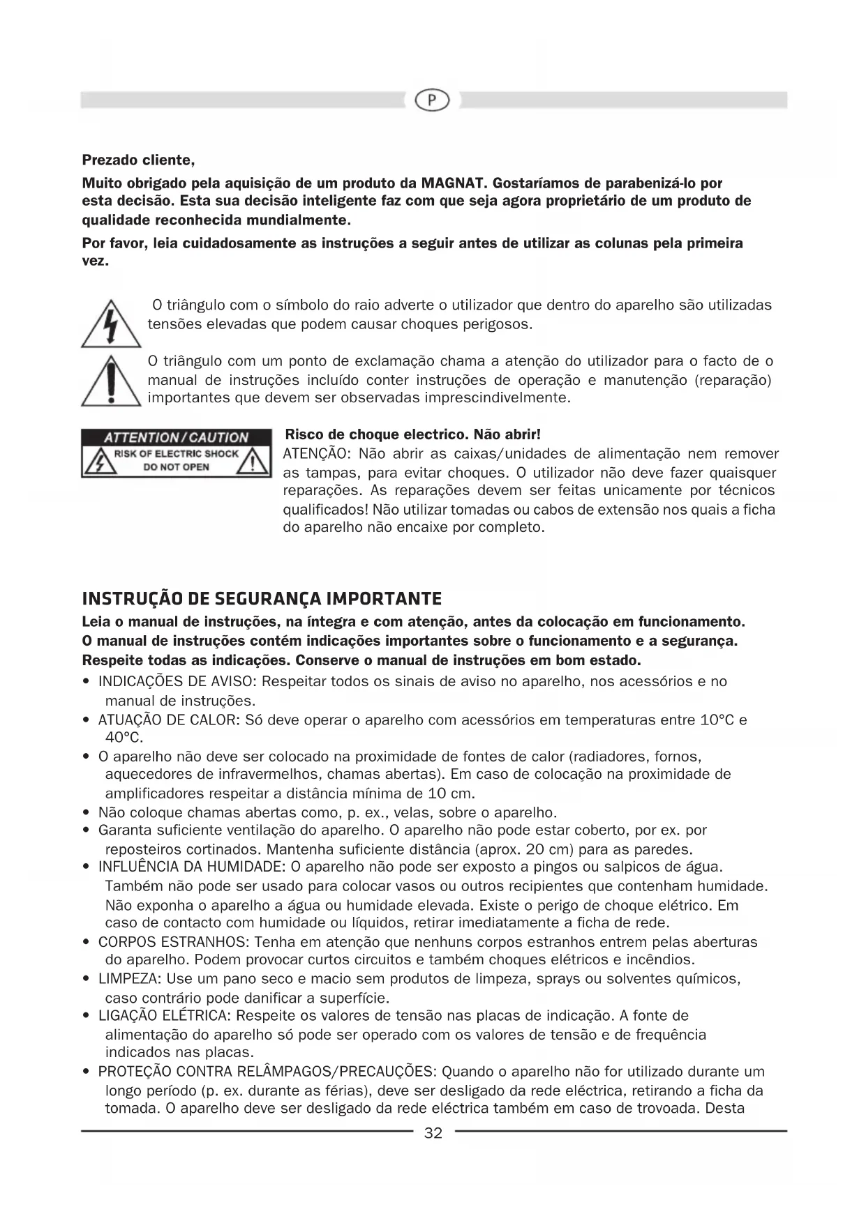 Configuración: Subwoofer activo reflejo bajo, principio downfire Componentes: Unidad de largo recorrido de 38 cm Potencia de salida RMS/Máx.: 150 / 300 vatios Gama de frecuencias: 17 – 200 Hz Frecuencia de separación: 50 – 150 Hz regulable Dimensiones (an x al x pr): 458 x 545 x 620 mm Accesorios: Cable de la red Reservados los derechos de realizar cambios técnicos.32 Prezado cliente, Muito obrigado pela aquisição de um produto da MAGNAT. Gostaríamos de parabenizá-lo por esta decisão. Esta sua decisão inteligente faz com que seja agora proprietário de um produto de qualidade reconhecida mundialmente. Por favor, leia cuidadosamente as instruções a seguir antes de utilizar as colunas pela primeira vez. O triângulo com o símbolo do raio adverte o utilizador que dentro do aparelho são utilizadas tensões elevadas que podem causar choques perigosos. O triângulo com um ponto de exclamação chama a atenção do utilizador para o facto de o manual de instruções incluído conter instruções de operação e manutenção (reparação) importantes que devem ser observadas imprescindivelmente. Risco de choque electrico. Não abrir! ATENÇÃO: Não abrir as caixas/unidades de alimentação nem remover as tampas, para evitar choques. O utilizador não deve fazer quaisquer reparações. As reparações devem ser feitas unicamente por técnicos qualificados! Não utilizar tomadas ou cabos de extensão nos quais a ficha do aparelho não encaixe por completo.