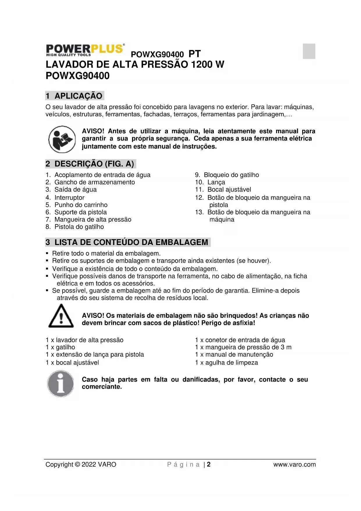 - Se possível, guarde a embalagem até ao fim do período de garantia. Elimine-a depois através do seu sistema de recolha de resíduos local. AVISO! Os materiais de embalagem não são brinquedos! As crianças não devem brincar com sacos de plástico! Perigo de asfixia! 1 x lavador de alta pressão 1 x gatilho 1 x extensão de lança para pistola 1 x bocal ajustável 1 x conetor de entrada de água 1 x mangueira de pressão de 3 m 1 x manual de manutenção 1 x agulha de limpeza Caso haja partes em falta ou danificadas, por favor, contacte o seu comerciante.POWXG90400 PT Copyright © 2022 VARO P á g i n a | 3 www.varo.com 4 INSTRUÇÕES ADICIONAIS PARA OS LIMPADORES DE ALTA PRESSÃO