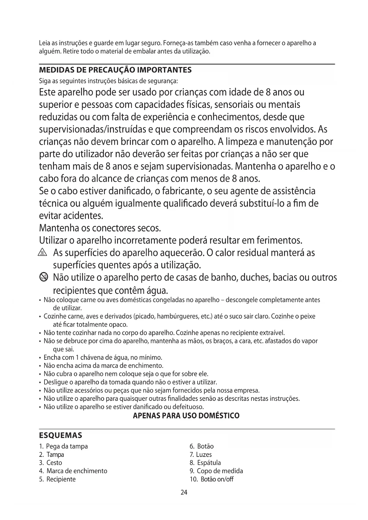 Siga as seguintes instruções básicas de segurança: Este aparelho pode ser usado por crianças com idade de 8 anos ou superior e pessoas com capacidades físicas, sensoriais ou mentais reduzidas ou com falta de experiência e conhecimentos, desde que supervisionadas/instruídas e que compreendam os riscos envolvidos. As crianças não devem brincar com o aparelho. A limpeza e manutenção por parte do utilizador não deverão ser feitas por crianças a não ser que tenham mais de 8 anos e sejam supervisionadas. Mantenha o aparelho e o cabo fora do alcance de crianças com menos de 8 anos. Se o cabo estiver danificado, o fabricante, o seu agente de assistência técnica ou alguém igualmente qualificado deverá substituí-lo a fim de evitar acidentes. Mantenha os conectores secos. Utilizar o aparelho incorretamente poderá resultar em ferimentos.