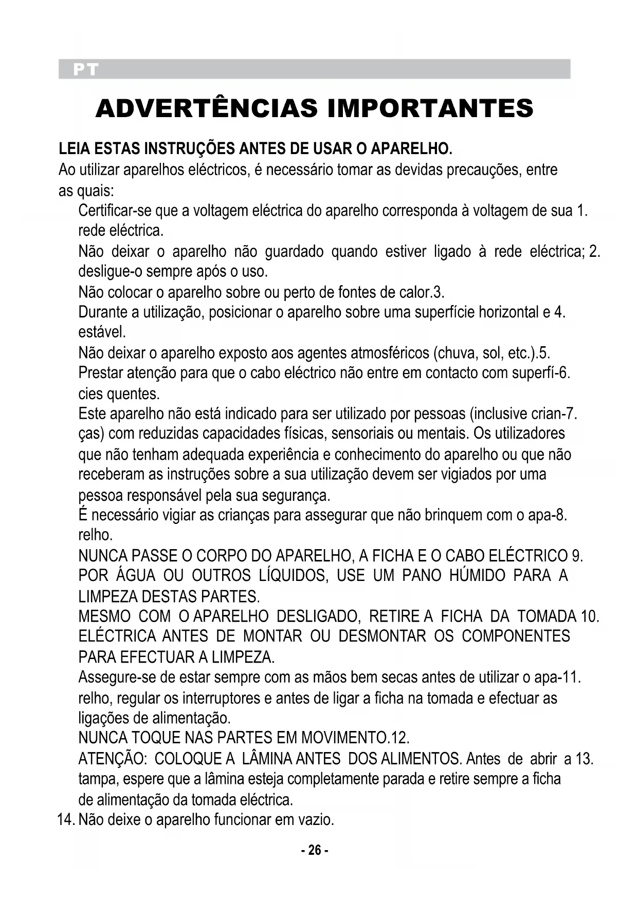 LEIA ESTAS INSTRUÇÕES ANTES DE USAR O APARELHO. Ao utilizar aparelhos eléctricos, é necessário tomar as devidas precauções, entre as quais: Certificar-se que a voltagem eléctrica do aparelho corresponda à voltagem de sua 1. rede eléctrica. Não deixar o aparelho não guardado quando estiver ligado à rede eléctrica; 2. desligue-o sempre após o uso. Não colocar o aparelho sobre ou perto de fontes de calor.3. Durante a utilização, posicionar o aparelho sobre uma superfície horizontal e 4. estável. Não deixar o aparelho exposto aos agentes atmosféricos (chuva, sol, etc.).5. Prestar atenção para que o cabo eléctrico não entre em contacto com superfí-6. cies quentes. Este aparelho não está indicado para ser utilizado por pessoas (inclusive crian-7. ças) com reduzidas capacidades físicas, sensoriais ou mentais. Os utilizadores que não tenham adequada experiência e conhecimento do aparelho ou que não receberam as instruções sobre a sua utilização devem ser vigiados por uma pessoa responsável pela sua segurança. É necessário vigiar as crianças para assegurar que não brinquem com o apa-8. relho. NUNCA PASSE O CORPO DO APARELHO, A FICHA E O CABO ELÉCTRICO 9. POR ÁGUA OU OUTROS LÍQUIDOS, USE UM PANO HÚMIDO PARA A LIMPEZA DESTAS PARTES. MESMO COM O APARELHO DESLIGADO, RETIRE A FICHA DA TOMADA 10. ELÉCTRICA ANTES DE MONTAR OU DESMONTAR OS COMPONENTES PARA EFECTUAR A LIMPEZA. Assegure-se de estar sempre com as mãos bem secas antes de utilizar o apa-11. relho, regular os interruptores e antes de ligar a ficha na tomada e efectuar as ligações de alimentação. NUNCA TOQUE NAS PARTES EM MOVIMENTO.12. ATENÇÃO: COLOQUE A LÂMINA ANTES DOS ALIMENTOS. Antes de abrir a 13. tampa, espere que a lâmina esteja completamente parada e retire sempre a ficha de alimentação da tomada eléctrica. Não deixe o aparelho funcionar em vazio.14.PT
