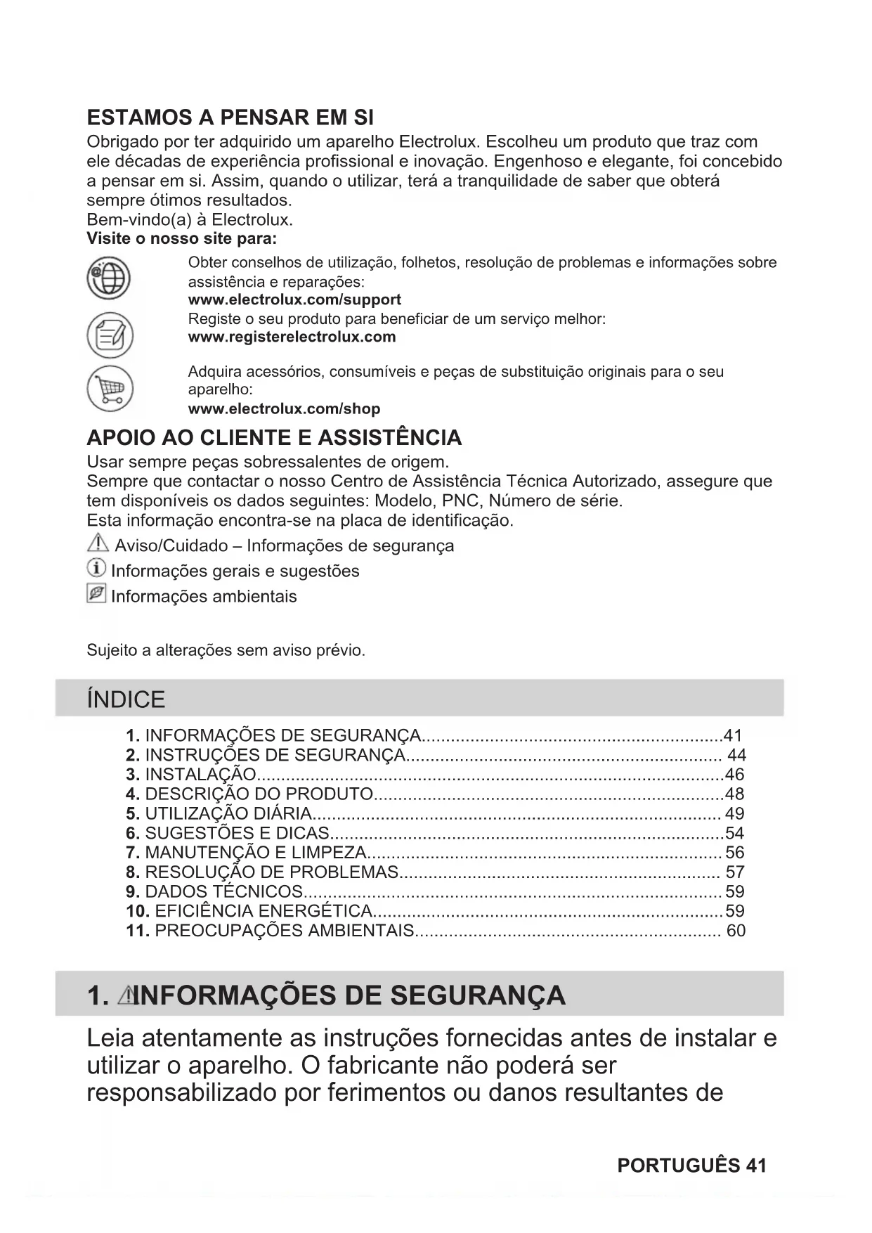 Obrigado por ter adquirido um aparelho Electrolux. Escolheu um produto que traz comele décadas de experiência profissional e inovação. Engenhoso e elegante, foi concebidoa pensar em si. Assim, quando o utilizar, terá a tranquilidade de saber que obterásempre ótimos resultados.Bem-vindo(a) à Electrolux.Visite o nosso site para:Obter conselhos de utilização, folhetos, resolução de problemas e informações sobreassistência e reparações:www.electrolux.com/supportRegiste o seu produto para beneficiar de um serviço melhor:www.registerelectrolux.comAdquira acessórios, consumíveis e peças de substituição originais para o seuaparelho:www.electrolux.com/shop