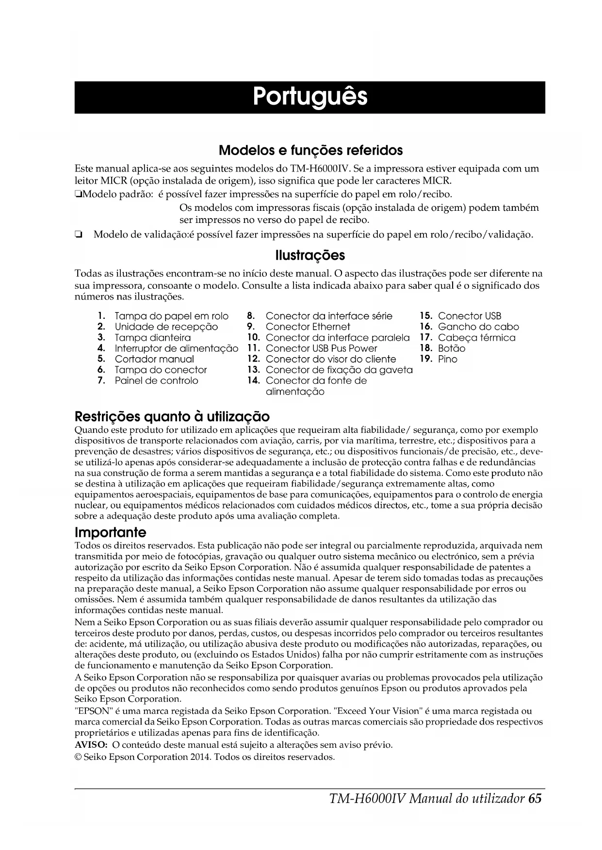 English Português Modelos e funções referidos Este manual aplica-se aos seguintes modelos do TM-H6000IV. Se a impressora estiver equipada com um leitor MICR (opção instalada de origem), isso significa que pode ler caracteres MICR. ❏ Modelo padrão: é possível fazer impressões na superfície do papel em rolo/recibo. Os modelos com impressoras fiscais (opção instalada de origem) podem também ser impressos no verso do papel de recibo. ❏ Modelo de validação:é possível fazer impressões na superfície do papel em rolo/recibo/validação. Ilustrações Todas as ilustrações encontram-se no início deste manual. O aspecto das ilustrações pode ser diferente na sua impressora, consoante o modelo. Consulte a lista indicada abaixo para saber qual é o significado dos números nas ilustrações. Restrições quanto à utilização Quando este produto for utilizado em aplicações que requeiram alta fiabilidade/ segurança, como por exemplo dispositivos de transporte relacionados com aviação, carris, por via marítima, terrestre, etc.; dispositivos para a prevenção de desastres; vários dispositivos de segurança, etc.; ou dispositivos funcionais/de precisão, etc., deve- se utilizá-lo apenas após considerar-se adequadamente a inclusão de protecção contra falhas e de redundâncias na sua construção de forma a serem mantidas a segurança e a total fiabilidade do sistema. Como este produto não se destina à utilização em aplicações que requeiram fiabilidade/segurança extremamente altas, como equipamentos aeroespaciais, equipamentos de base para comunicações, equipamentos para o controlo de energia nuclear, ou equipamentos médicos relacionados com cuidados médicos directos, etc., tome a sua própria decisão sobre a adequação deste produto após uma avaliação completa. Importante Todos os direitos reservados. Esta publicação não pode ser integral ou parcialmente reproduzida, arquivada nem transmitida por meio de fotocópias, gravação ou qualquer outro sistema mecânico ou electrónico, sem a prévia autorização por escrito da Seiko Epson Corporation. Não é assumida qualquer responsabilidade de patentes a respeito da utilização das informações contidas neste manual. Apesar de terem sido tomadas todas as precauções na preparação deste manual, a Seiko Epson Corporation não assume qualquer responsabilidade por erros ou omissões. Nem é assumida também qualquer responsabilidade de danos resultantes da utilização das informações contidas neste manual. Nem a Seiko Epson Corporation ou as suas filiais deverão assumir qualquer responsabilidade pelo comprador ou terceiros deste produto por danos, perdas, custos, ou despesas incorridos pelo comprador ou terceiros resultantes de: acidente, má utilização, ou utilização abusiva deste produto ou modificações não autorizadas, reparações, ou alterações deste produto, ou (excluindo os Estados Unidos) falha por não cumprir estritamente com as instruções de funcionamento e manutenção da Seiko Epson Corporation. A Seiko Epson Corporation não se responsabiliza por quaisquer avarias ou problemas provocados pela utilização de opções ou produtos não reconhecidos como sendo produtos genuínos Epson ou produtos aprovados pela Seiko Epson Corporation. "EPSON" é uma marca registada da Seiko Epson Corporation. "Exceed Your Vision" é uma marca registada ou marca comercial da Seiko Epson Corporation. Todas as outras marcas comerciais são propriedade dos respectivos proprietários e utilizadas apenas para fins de identificação. AV I S O : O conteúdo deste manual está sujeito a alterações sem aviso prévio. © Seiko Epson Corporation 2014. Todos os direitos reservados.