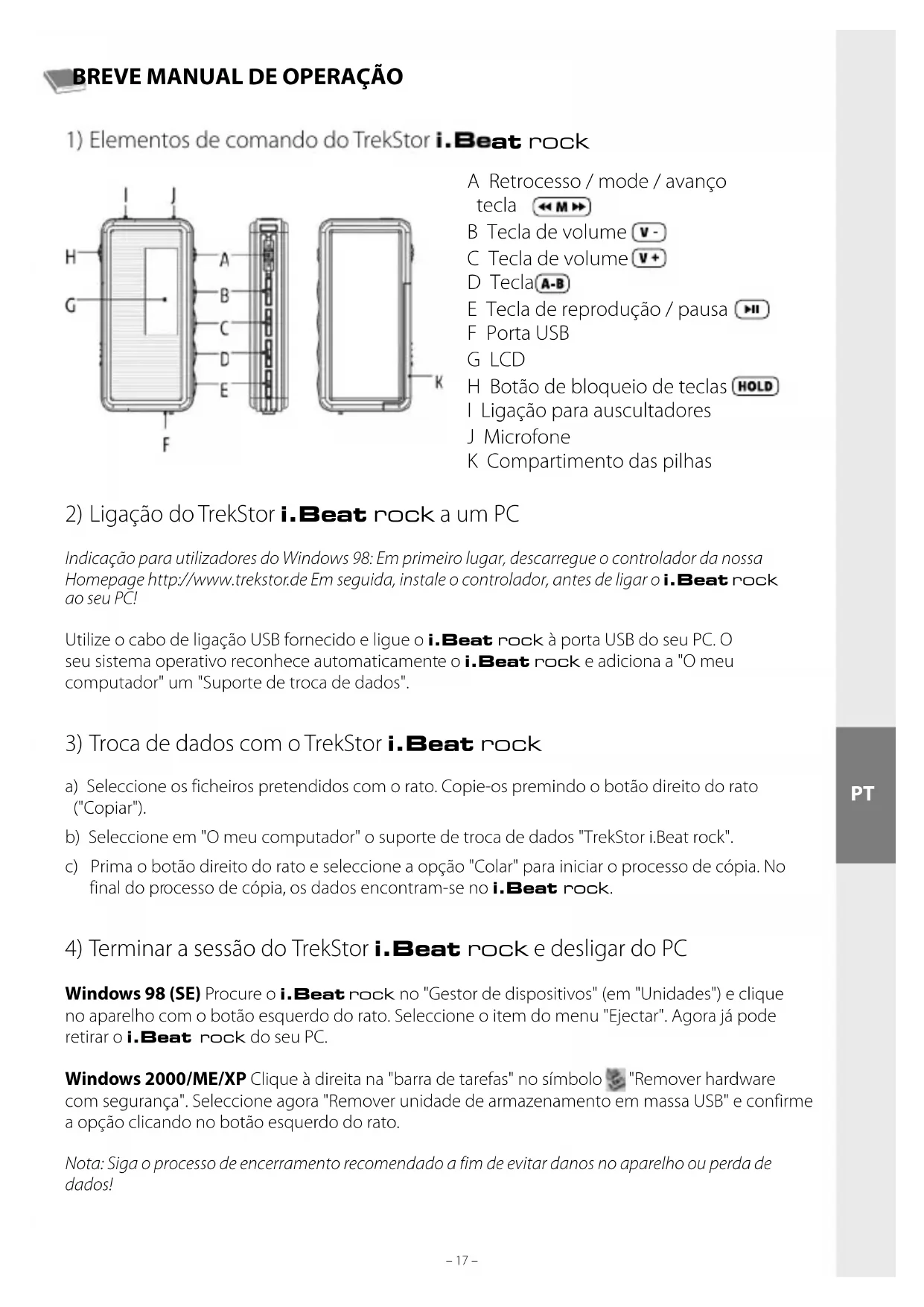 Windows 98 (SE) Procure o i.Beat rock no "Gestor de dispositivos" (em "Unidades") e clique no aparelho com o botão esquerdo do rato. Seleccione o item do menu "Ejectar". Agora já pode retirar o i.Beat rock do seu PC. Windows 2000/ME/XP Clique à direita na "barra de tarefas" no símbolo "Remover hardware com segurança". Seleccione agora "Remover unidade de armazenamento em massa USB" e confirme a opção clicando no botão esquerdo do rato. Nota: Siga o processo de encerramento recomendado a fim de evitar danos no aparelho ou perda de dados! A Retrocesso / mode / avanço tecla B Tecla de volume C Tecla de volume D Tecla E Tecla de reprodução / pausa F Porta USB G LCD H Botão de bloqueio de teclas I Ligação para auscultadores J Microfone K Compartimento das pilhasPT – 18 – – 19 –