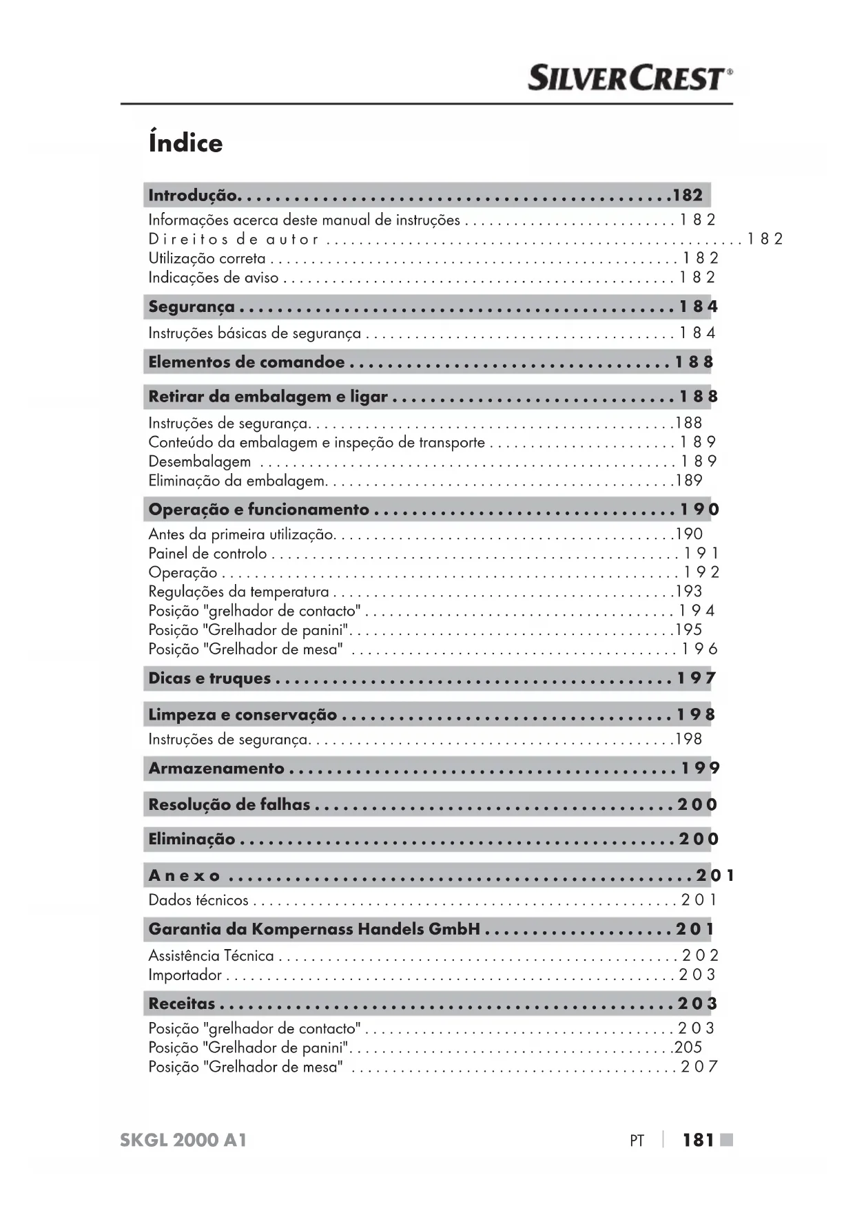PT Introdução Informações acerca deste manual de instruções Parabéns pela compra do seu novo aparelho. Optou por um produto de elevada qualidade. O manual de instruções é parte integrante deste produto. Este contém instruções importantes para a segurança, a utilização e a eliminação. Antes de utilizar o produto, familiarize-se com todas as instruções de operação e segurança. Utilize o produto apenas como descrito e nas áreas de aplicação indicadas. Ao transferir o produto para terceiros, entregue todos os respetivos documentos. Direitos de autor Esta documentação está protegida por direitos de autor. Não é permitido duplicar ou reimprimir, total ou parcialmente, o presente docu- mento, bem como reproduzir imagens, mesmo com alterações, sem a autoriza- ção por escrito do fabricante. Utilização correta Este aparelho foi concebido exclusivamente para grelhar alimentos em espaços interiores. Qualquer utilização diferente ou fora do âmbito descrito é conside- rada incorreta. O aparelho não se destina à utilização em áreas comerciais ou industriais. Não é assumida qualquer responsabilidade por danos resultantes da utilização incorreta, de reparações indevidas, de alterações não autorizadas ou da utiliza- ção de peças sobresselentes não permitidas. O risco é assumido exclusivamente pelo proprietário. Indicações de aviso No presente manual de instruções são utilizadas as seguintes indicações de aviso: PERIGO Uma indicação de aviso deste nível de perigo identifica uma situação de perigo iminente. Se a situação de perigo não for evitada, existe perigo de morte ou de feri- mentos graves. ► Seguir as instruções desta indicação de aviso para evitar o perigo de morte ou de ferimentos graves de pessoas.SKGL 2000 A1 PT