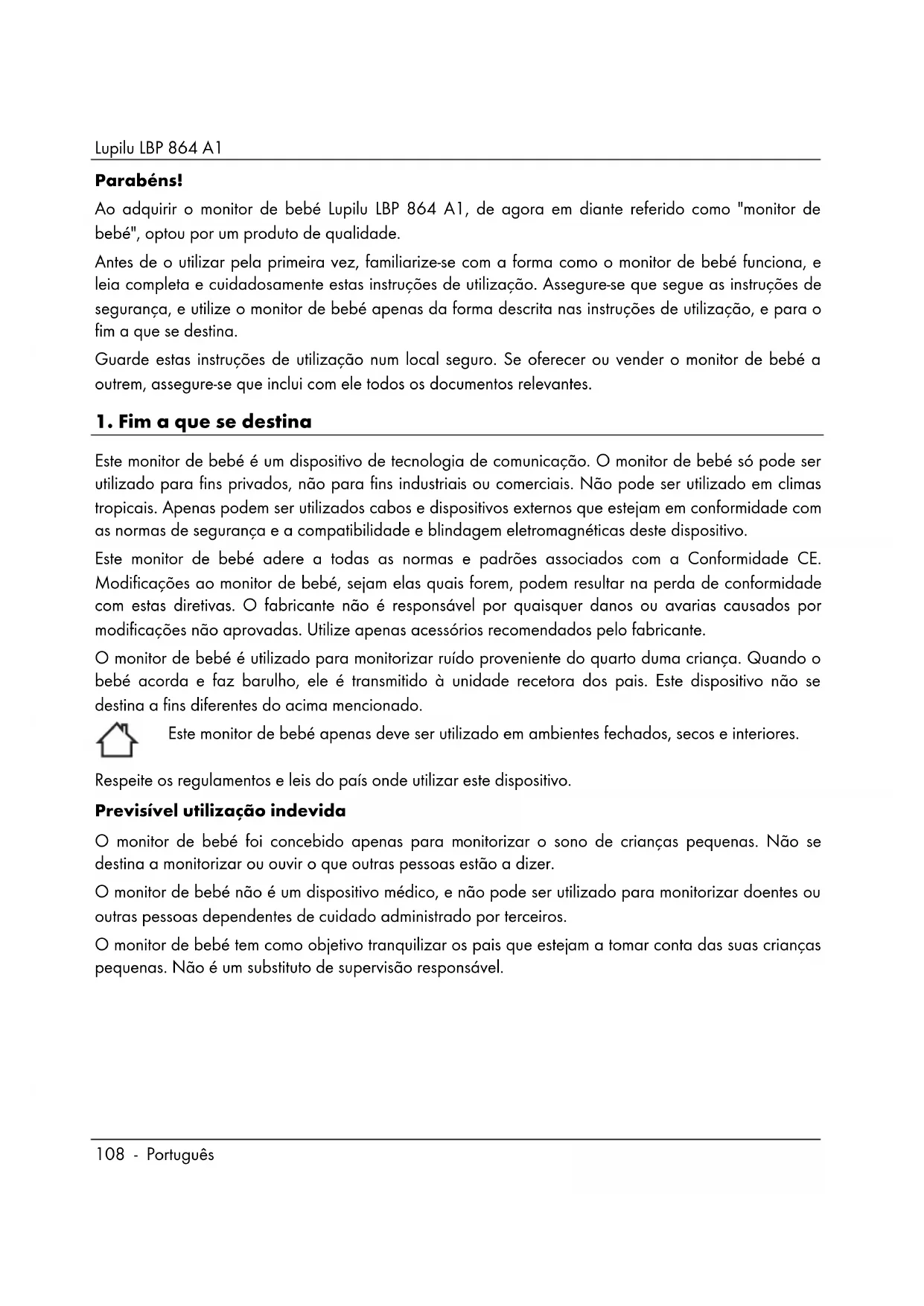 Parabéns! Ao adquirir o monitor de bebé Lupilu LBP 864 A1, de agora em diante referido como "monitor de bebé", optou por um produto de qualidade. Antes de o utilizar pela primeira vez, familiarize-se com a forma como o monitor de bebé funciona, e leia completa e cuidadosamente estas instruções de utilização. Assegure-se que segue as instruções de segurança, e utilize o monitor de bebé apenas da forma descrita nas instruções de utilização, e para o fim a que se destina. Guarde estas instruções de utilização num local seguro. Se oferecer ou vender o monitor de bebé a outrem, assegure-se que inclui com ele todos os documentos relevantes.
