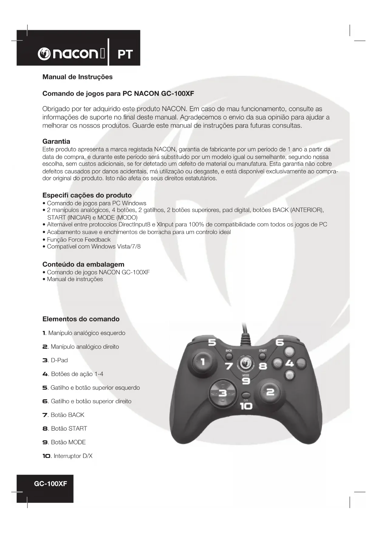 GC-100XF Manual de Instruções Comando de jogos para PC NACON GC-100XF Obrigado por ter adquirido este produto NACON. Em caso de mau funcionamento, consulte as informações de suporte no fi nal deste manual. Agradecemos o envio da sua opinião para ajudar a melhorar os nossos produtos. Guarde este manual de instruções para futuras consultas. Garantia Este produto apresenta a marca registada NACON, garantia de fabricante por um período de 1 ano a partir da data de compra, e durante este período será substituído por um modelo igual ou semelhante, segundo nossa escolha, sem custos adicionais, se for detetado um defeito de material ou manufatura. Esta garantia não cobre defeitos causados por danos acidentais, má utilização ou desgaste, e está disponível exclusivamente ao compra- dor original do produto. Isto não afeta os seus direitos estatutários. Especifi cações do produto