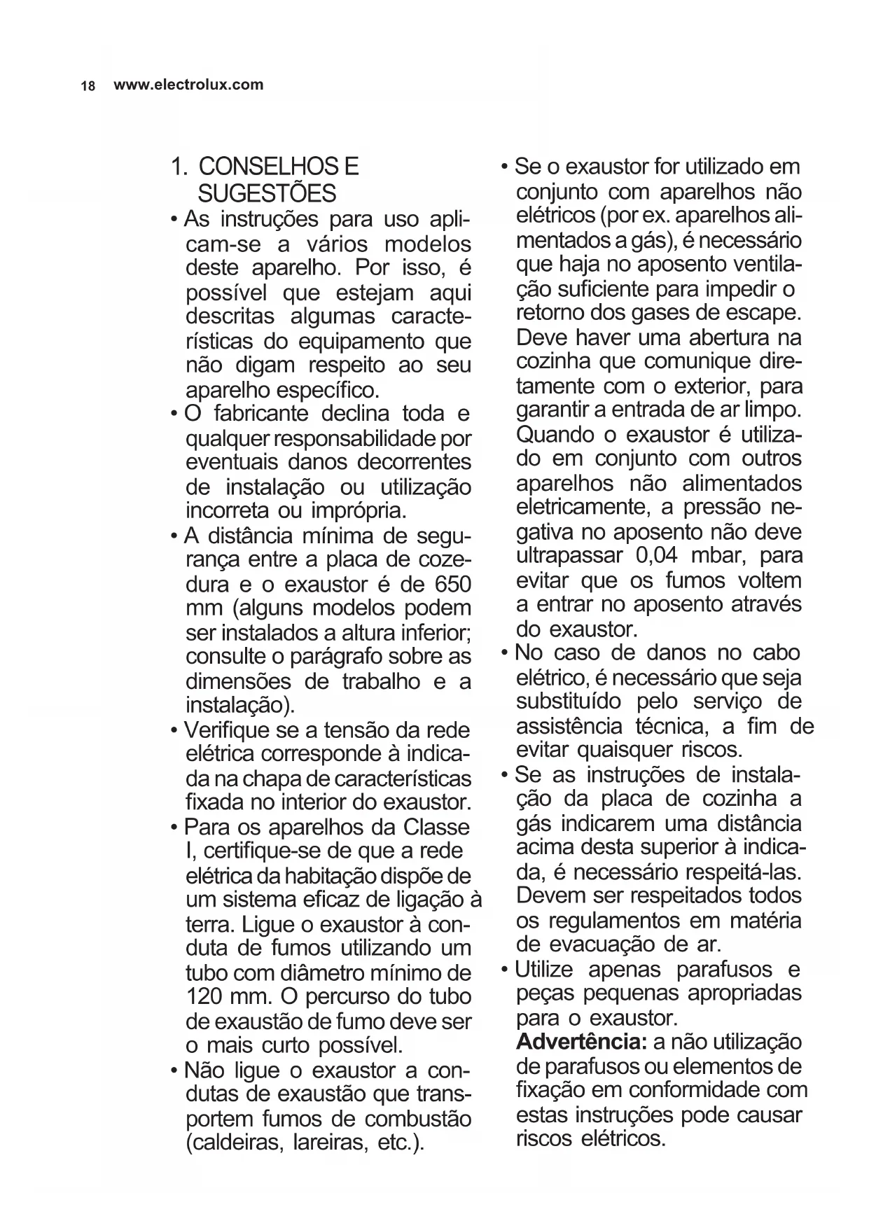 - Não ligue o exaustor a con- dutas de exaustão que trans- portem fumos de combustão (caldeiras, lareiras, etc.).