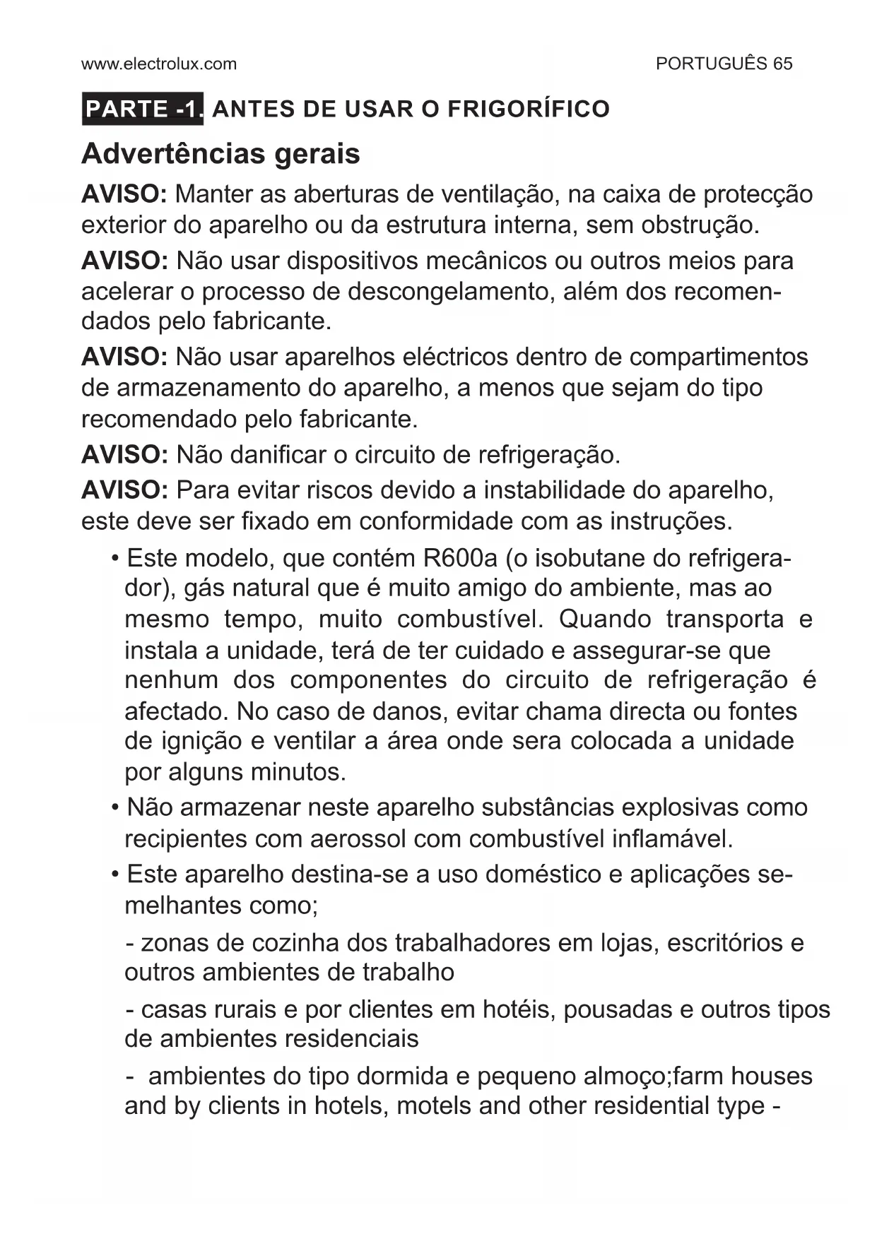 Reposicionar a porta ..................................................................................................80 ANTES DE CONTACTAR O SERVIÇO DE ASSISTÊNCIA TÉCNICA ......... 80 THE PARTS OF THE APPLIANCE AND THE COMPARTMENTS ............... 84www.electrolux.com PORTUGUÊS 65 PARTE -1. ANTES DE USAR O FRIGORÍFICO Advertências gerais AVISO: Manter as aberturas de ventilação, na caixa de protecção exterior do aparelho ou da estrutura interna, sem obstrução. AVISO: Não usar dispositivos mecânicos ou outros meios para acelerar o processo de descongelamento, além dos recomen- dados pelo fabricante. AVISO: Não usar aparelhos eléctricos dentro de compartimentos de armazenamento do aparelho, a menos que sejam do tipo recomendado pelo fabricante. AVISO: Não danicar o circuito de refrigeração. AVISO: Para evitar riscos devido a instabilidade do aparelho, este deve ser xado em conformidade com as instruções.