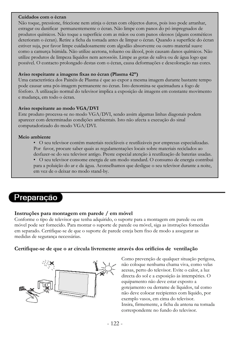 Cuidados com o écran Não toque, pressione, friccione nem atinja o écran com objectos duros, pois isso pode arranhar, estragar ou danificar permanentemente o écran. Não limpe com panos do pó impregnados de produtos químicos. Não toque a superfície com as mãos ou com panos oleosos (alguns cosméticos deterioram o écran). Retire a ficha da tomada antes de limpar o écran. Quando a superfície do écran estiver suja, por favor limpe cuidadosamente com algodão absorvente ou outro material suave como a camurça húmida. Não utilize acetona, tolueno ou álcool, pois causam danos químicos. Não utilize produtos de limpeza líquidos nem aerossóis. Limpe as gotas de saliva ou de água logo que possível. O contacto prolongado destas com o écran, causa deformações e descoloração nas cores. Aviso respeitante a imagens fixas no écran (Plasma 42”) Uma característica dos Painéis de Plasma é que ao expor a mesma imagem durante bastante tempo pode causar uma pós-imagem permanente no écran. Isto denomina-se queimadura a fogo de fósforo. A utilização normal do televisor implica a exposição de imagens em constante movimento e mudança, em todo o écran. Aviso respeitante ao modo VGA/DVI Este produto processa-se no modo VGA/DVI, sendo assim algumas linhas diagonais podem aparecer com determinadas condições ambientais. Isto não afecta a execução do sinal computadorizado do modo VGA/DVI. Meio ambiente • O seu televisor contém materiais recicláveis e reutilizáveis por empresas especializadas. Por favor, procure saber quais as regulamentações locais sobre materiais reciclados ao desfazer-se do seu televisor antigo. Preste especial atenção à reutilização de baterias usadas. • O seu televisor consome energia de um modo standard. O consumo de energia contribui para a poluição do ar e da água. Aconselhamos que desligue o seu televisor durante a noite, em vez de o deixar no modo stand-by.