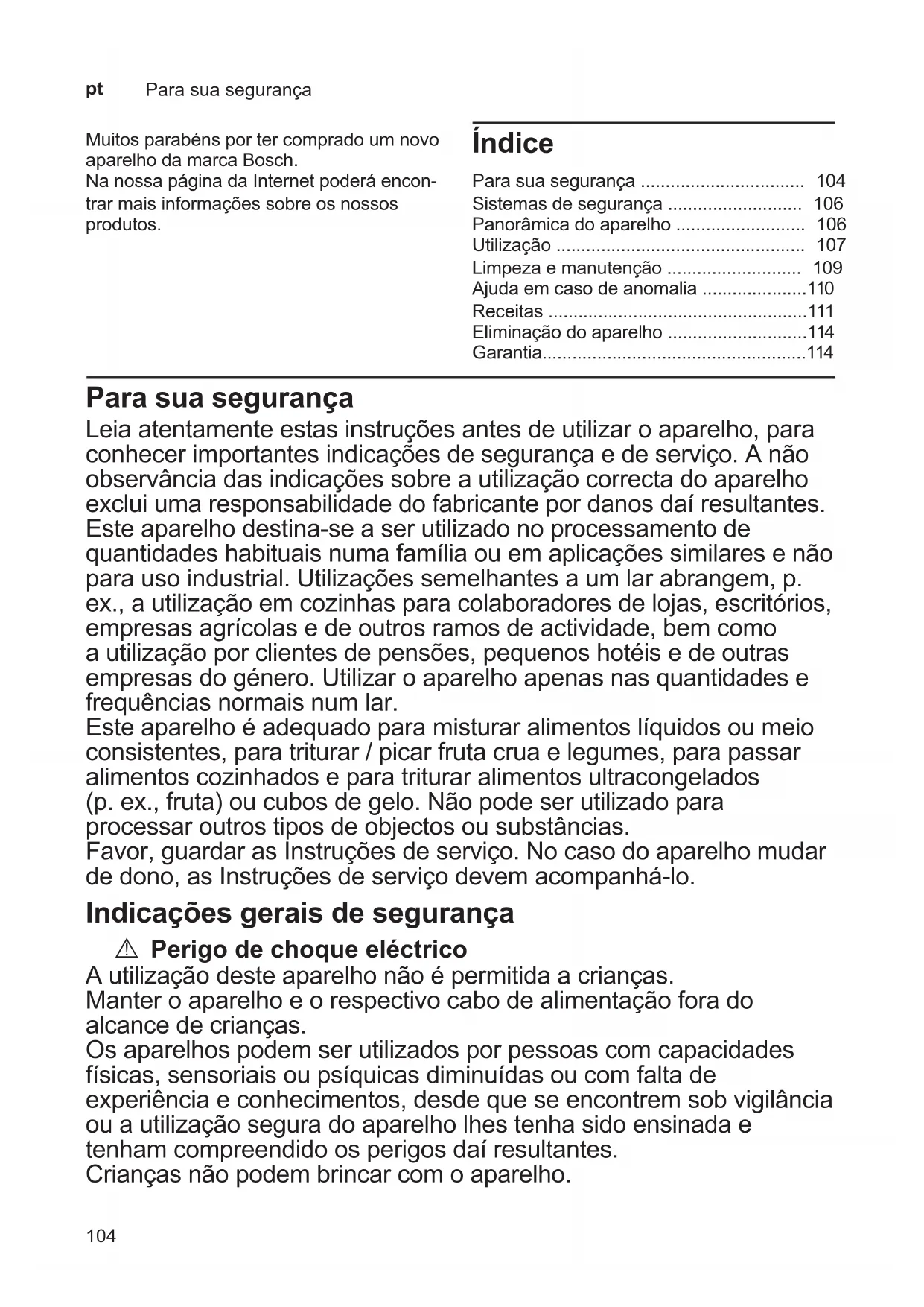- Para sua segurança Leiaatentamenteestasinstruçõesantesdeutilizaroaparelho,para conhecerimportantesindicaçõesdesegurançaedeserviço.Anão observânciadasindicaçõessobreautilizaçãocorrectadoaparelho excluiumaresponsabilidadedofabricantepordanosdaíresultantes. Esteaparelhodestina-seaserutilizadonoprocessamentode quantidadeshabituaisnumafamíliaouemaplicaçõessimilaresenão parausoindustrial.Utilizaçõessemelhantesaumlarabrangem,p. ex.,autilizaçãoemcozinhasparacolaboradoresdelojas,escritórios, empresasagrícolasedeoutrosramosdeactividade,bemcomo autilizaçãoporclientesdepensões,pequenoshotéisedeoutras empresasdogénero.Utilizaroaparelhoapenasnasquantidadese frequênciasnormaisnumlar. Esteaparelhoéadequadoparamisturaralimentoslíquidosoumeio consistentes,paratriturar/picarfrutacruaelegumes,parapassar alimentoscozinhadoseparatrituraralimentosultracongelados (p.ex.,fruta)oucubosdegelo.Nãopodeserutilizadopara processaroutrostiposdeobjectosousubstâncias. Favor,guardarasInstruçõesdeserviço.Nocasodoaparelhomudar dedono,asInstruçõesdeserviçodevemacompanhá-lo. Indicações gerais de segurança A Perigo de choque eléctrico Autilizaçãodesteaparelhonãoépermitidaacrianças. Manteroaparelhoeorespectivocabodealimentaçãoforado alcancedecrianças. Osaparelhospodemserutilizadosporpessoascomcapacidades físicas,sensoriaisoupsíquicasdiminuídasoucomfaltade experiênciaeconhecimentos,desdequeseencontremsobvigilância ouautilizaçãoseguradoaparelholhestenhasidoensinadae tenhamcompreendidoosperigosdaíresultantes. Criançasnãopodembrincarcomoaparelho. Muitosparabénsportercompradoumnovo aparelhodamarcaBosch. NanossapáginadaInternetpoderáencon- trarmaisinformaçõessobreosnossos produtos. Índice Parasuasegurança p. 104