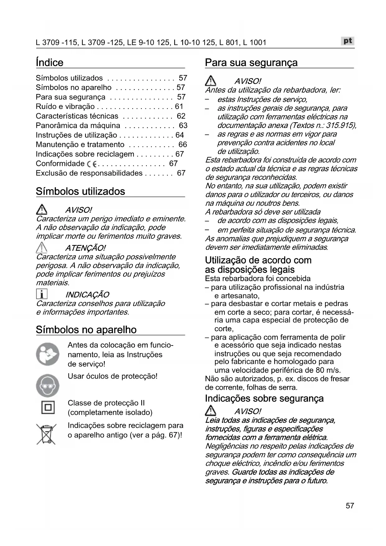 Utilização de acordo com as disposições legais Esta rebarbadora foi concebida – para utilização profissional na indústria e artesanato, – para desbastar e cortar metais e pedras em corte a seco; para cortar, é necessá- ria uma capa especial de protecção de corte, – para aplicação com ferramenta de polir e acessório que seja indicado nestas instruções ou que seja recomendado pelo fabricante e homologado para uma velocidade periférica de 80 m/s. Não são autorizados, p. ex. discos de fresar de corrente, folhas de serra. Indicações sobre segurança AVISO! Leia todas as indicações de segurança, instruções, figuras e especificações fornecidas com a ferramenta elétrica. Negligências no respeito pelas indicações de segurança podem ter como consequência um choque eléctrico, incêndio e/ou ferimentos graves. Guarde todas as indicações de segurança e instruções para o futuro.L 3709 -115, L 3709 -125, LE 9-10 125, L 10-10 125, L 801, L 1001
