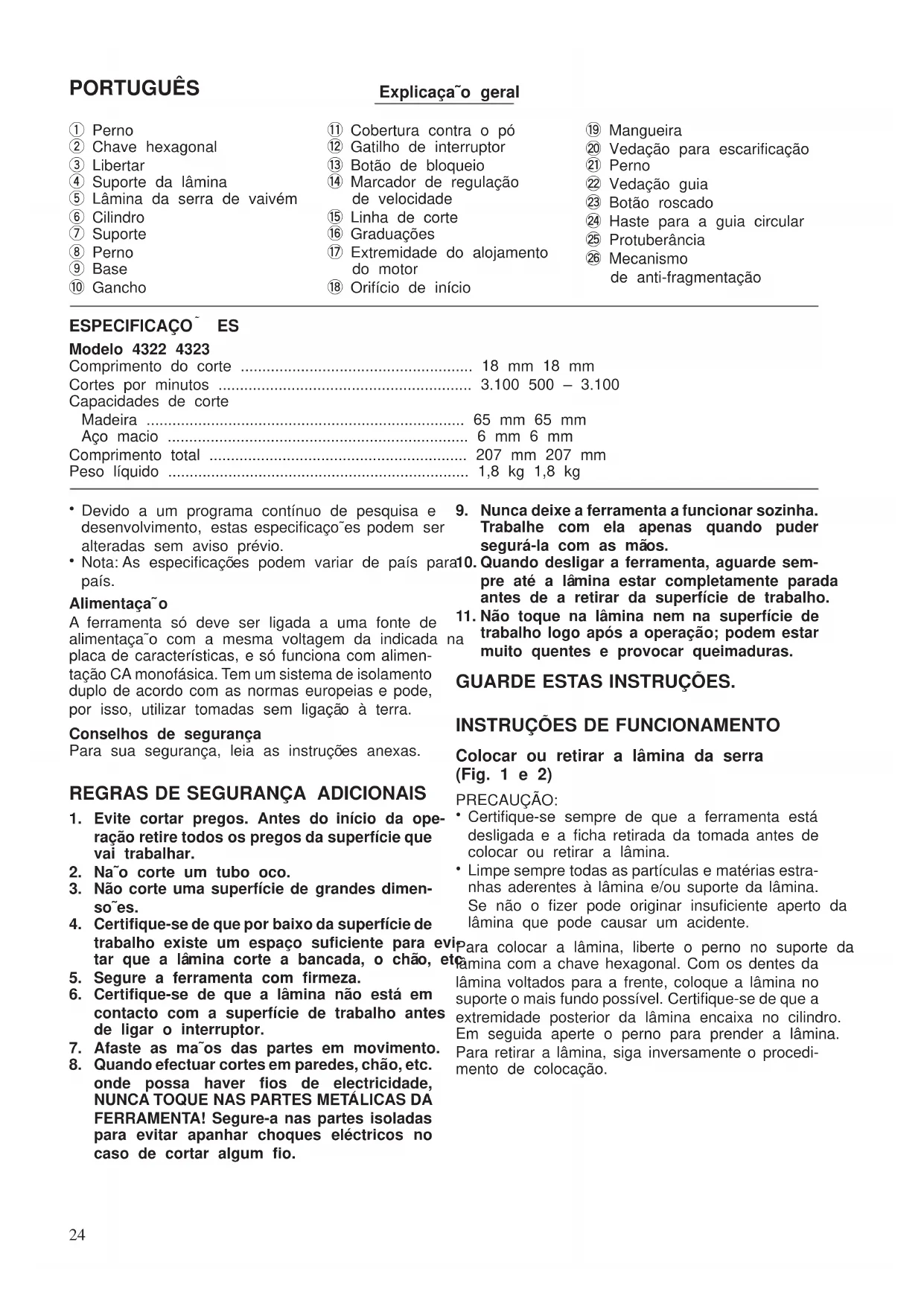 trabalho logo após a operaça˜o; podem estar muito quentes e provocar queimaduras. GUARDE ESTAS INSTRUÇOx ES. INSTRUÇOx ES DE FUNCIONAMENTO Colocar ou retirar a lâmina da serra (Fig. 1 e 2) PRECAUÇÃO: