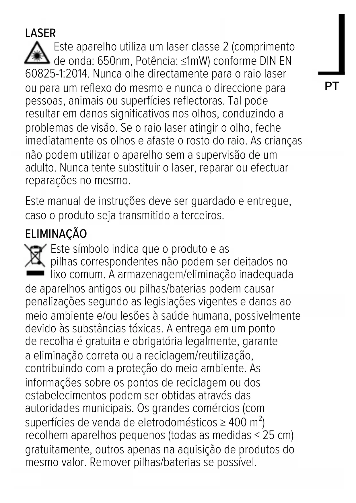 Este aparelho utiliza um laser classe 2 (comprimento de onda: 650nm, Potência: ≤1mW) conforme DIN EN 60825-1:2014. Nunca olhe directamente para o raio laser ou para um reflexo do mesmo e nunca o direccione para pessoas, animais ou superfícies reflectoras. Tal pode resultar em danos significativos nos olhos, conduzindo a problemas de visão. Se o raio laser atingir o olho, feche imediatamente os olhos e afaste o rosto do raio. As crianças não podem utilizar o aparelho sem a supervisão de um adulto. Nunca tente substituir o laser, reparar ou efectuar reparações no mesmo.