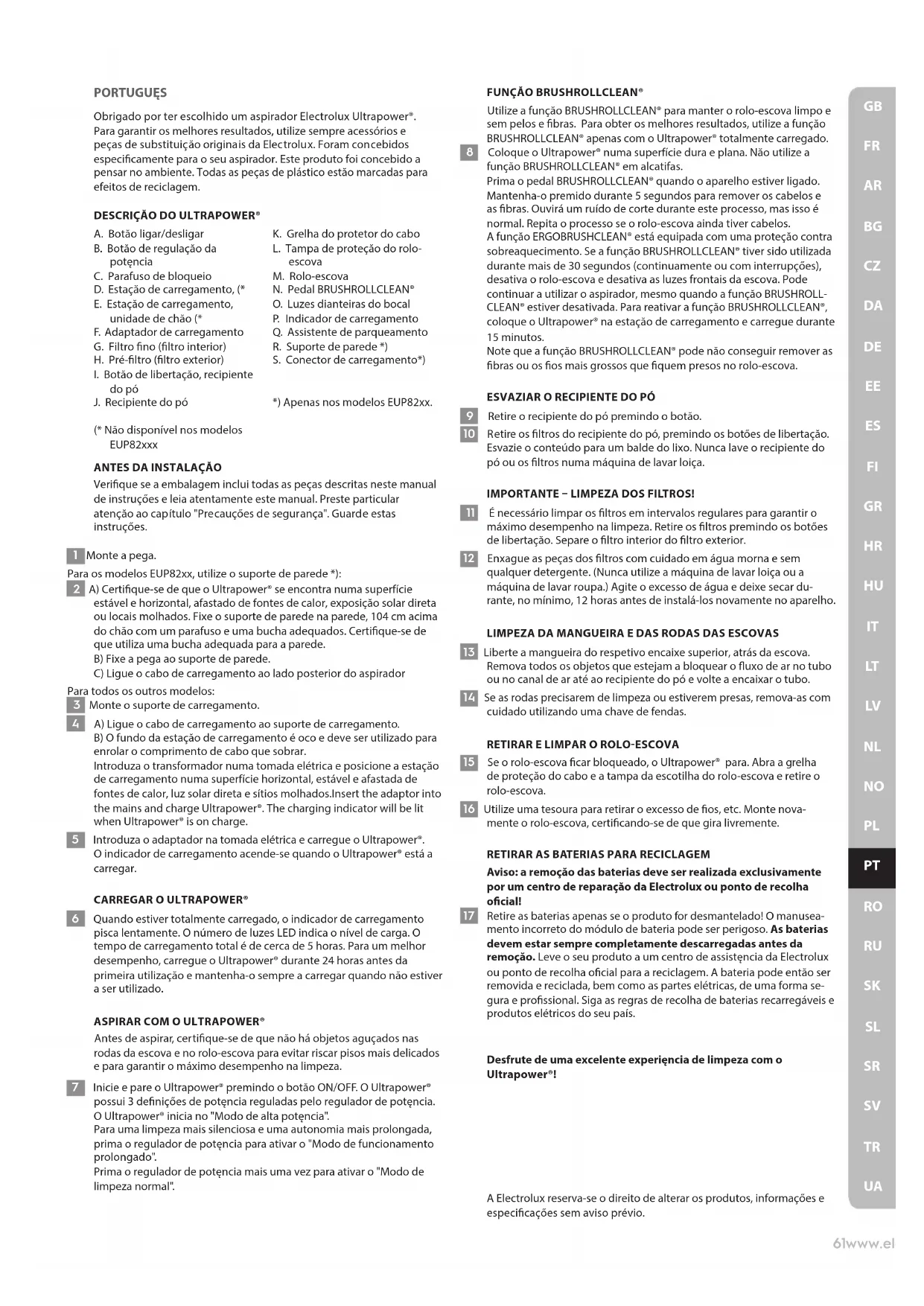 Aviso: a remoçăo das baterias deve ser realizada exclusivamente por um centro de reparaçăo da Electrolux ou ponto de recolha ocial! 17 Retire as baterias apenas se o produto for desmantelado! O manusea- mento incorreto do módulo de bateria pode ser perigoso. As baterias devem estar sempre completamente descarregadas antes da remoçăo. Leve o seu produto a um centro de assistęncia da Electrolux ou ponto de recolha ocial para a reciclagem. A bateria pode entăo ser removida e reciclada, bem como as partes elétricas, de uma forma se- gura e prossional. Siga as regras de recolha de baterias recarregáveis e produtos elétricos do seu país. Desfrute de uma excelente experięncia de limpeza com o Ultrapower®!62www.electrolux.com