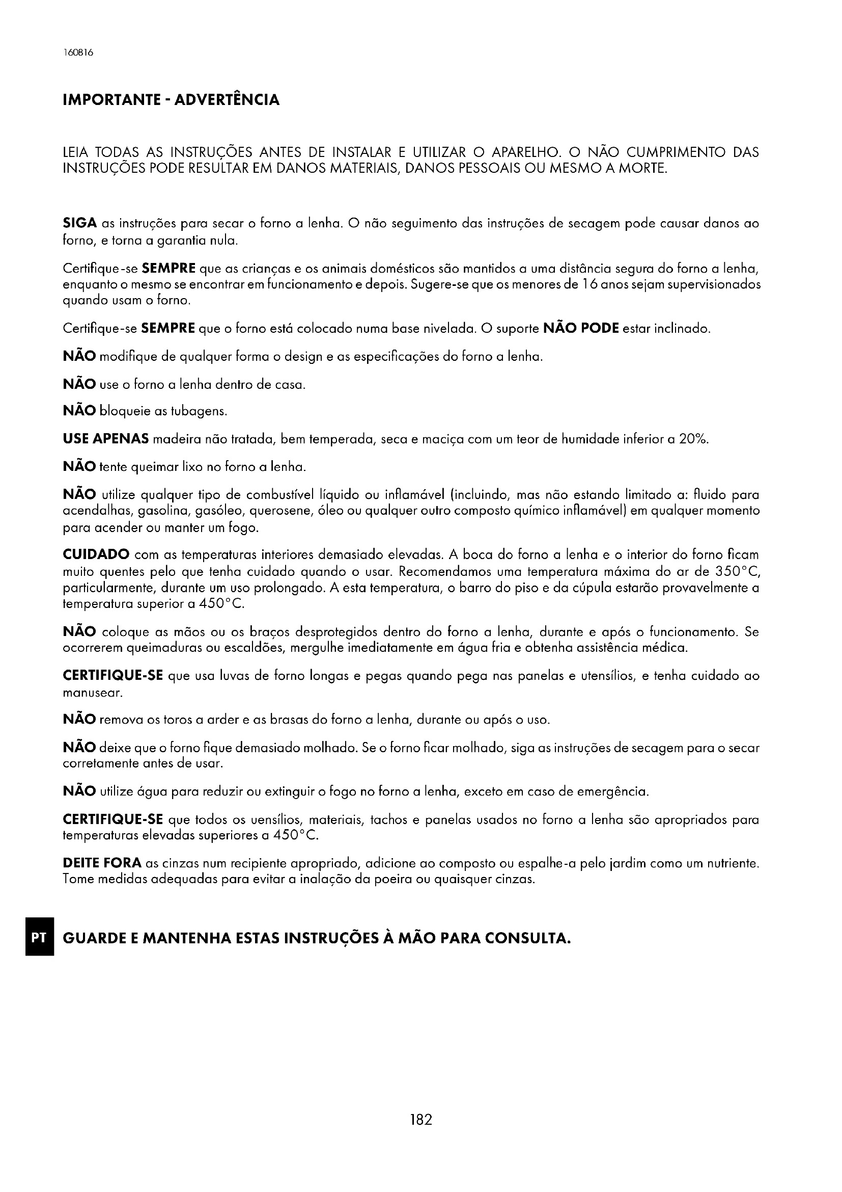 LEIA TODAS AS INSTRUÇÕES ANTES DE INSTALAR E UTILIZAR O APARELHO O NÃO CUMPRIMENTO DAS INSTRUÇÕES PODE RESULTAR EM DANOS MATERIAIS, DANOS PESSOAIS OU MESMO A MORTE SIGA as instruções para secar o forno a lenha O não seguimento das instruções de secagem pode causar danos ao forno, e torna a garantia nula Certifique-se SEMPRE que as crianças e os animais domésticos são mantidos a uma distância segura do forno a lenha, enquanto o mesmo se encontrar em funcionamento e depois Sugere-se que os menores de 16 anos sejam supervisionados quando usam o forno Certifique-se SEMPRE que o forno está colocado numa base nivelada O suporte NÃO PODE estar inclinado NÃO modifique de qualquer forma o design e as especificações do forno a lenha NÃO use o forno a lenha dentro de casa NÃO bloqueie as tubagens USE APENAS madeira não tratada, bem temperada, seca e maciça com um teor de humidade inferior a 20% NÃO tente queimar lixo no forno a lenha NÃO utilize qualquer tipo de combustível líquido ou inflamável (incluindo, mas não estando limitado a: fluido para acendalhas, gasolina, gasóleo, querosene, óleo ou qualquer outro composto químico inflamável) em qualquer momento para acender ou manter um fogo CUIDADO com as temperaturas interiores demasiado elevadas A boca do forno a lenha e o interior do forno ficam muito quentes pelo que tenha cuidado quando o usar Recomendamos uma temperatura máxima do ar de 350°C, particularmente, durante um uso prolongado A esta temperatura, o barro do piso e da cúpula estarão provavelmente a temperatura superior a 450°C NÃO coloque as mãos ou os braços desprotegidos dentro do forno a lenha, durante e após o funcionamento Se ocorrerem queimaduras ou escaldões, mergulhe imediatamente em água fria e obtenha assistência médica CERTIFIQUE-SE que usa luvas de forno longas e pegas quando pega nas panelas e utensílios, e tenha cuidado ao manusear NÃO remova os toros a arder e as brasas do forno a lenha, durante ou após o uso NÃO deixe que o forno fique demasiado molhado Se o forno ficar molhado, siga as instruções de secagem para o secar corretamente antes de usar NÃO utilize água para reduzir ou extinguir o fogo no forno a lenha, exceto em caso de emergência CERTIFIQUE-SE que todos os uensílios, materiais, tachos e panelas usados no forno a lenha são apropriados para temperaturas elevadas superiores a 450°C DEITE FORA as cinzas num recipiente apropriado, adicione ao composto ou espalhe-a pelo jardim como um nutriente Tome medidas adequadas para evitar a inalação da poeira ou quaisquer cinzas GUARDE E MANTENHA ESTAS INSTRUÇÕES À MÃO PARA CONSULTA. 160816PT