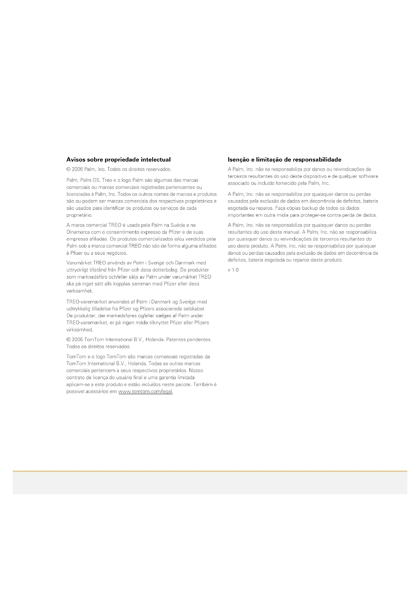 72Avisos sobre propriedade intelectual © 2006 Palm, Inc. Todos os direitos reservados. Palm, Palm OS, Treo e o logo Palm são algumas das marcas comerciais ou marcas comerciais registradas pertencentes ou licenciadas à Palm, Inc. Todos os outros nomes de marcas e produtos são ou podem ser marcas comerciais dos respectivos proprietários e são usados para identificar os produtos ou serviços de cada proprietário. A marca comercial TREO é usada pela Palm na Suécia e na Dinamarca com o consentimento expresso da Pfizer e de suas empresas afiliadas. Os produtos comercializados e/ou vendidos pela Palm sob a marca comercial TREO não são de forma alguma afiliados à Pfizer ou a seus negócios. Varumärket TREO används av Palm i Sverige och Danmark med uttryckligt tillstånd från Pfizer och dess dotterbolag. De produkter som marknadsförs och/eller säljs av Palm under varumärket TREO ska på inget sätt alls kopplas samman med Pfizer eller dess verksamhet. TREO-varemærket anvendes af Palm i Danmark og Sverige med udtrykkelig tilladelse fra Pfizer og Pfizers associerede selskaber. De produkter, der markedsføres og/eller sælges af Palm under TREO-varemærket, er på ingen måde tilknyttet Pfizer eller Pfizers virksomhed. © 2006 TomTom International B.V., Holanda. Patentes pendentes. Todos os direitos reservados. TomTom e o logo TomTom são marcas comerciais registradas da TomTom International B.V., Holanda. Todas as outras marcas comerciais pertencem a seus respectivos proprietários. Nosso contrato de licença do usuário final e uma garantia limitada aplicam-se a este produto e estão incluídos neste pacote. Também é possível acessá-los em www.tomtom.com/legal