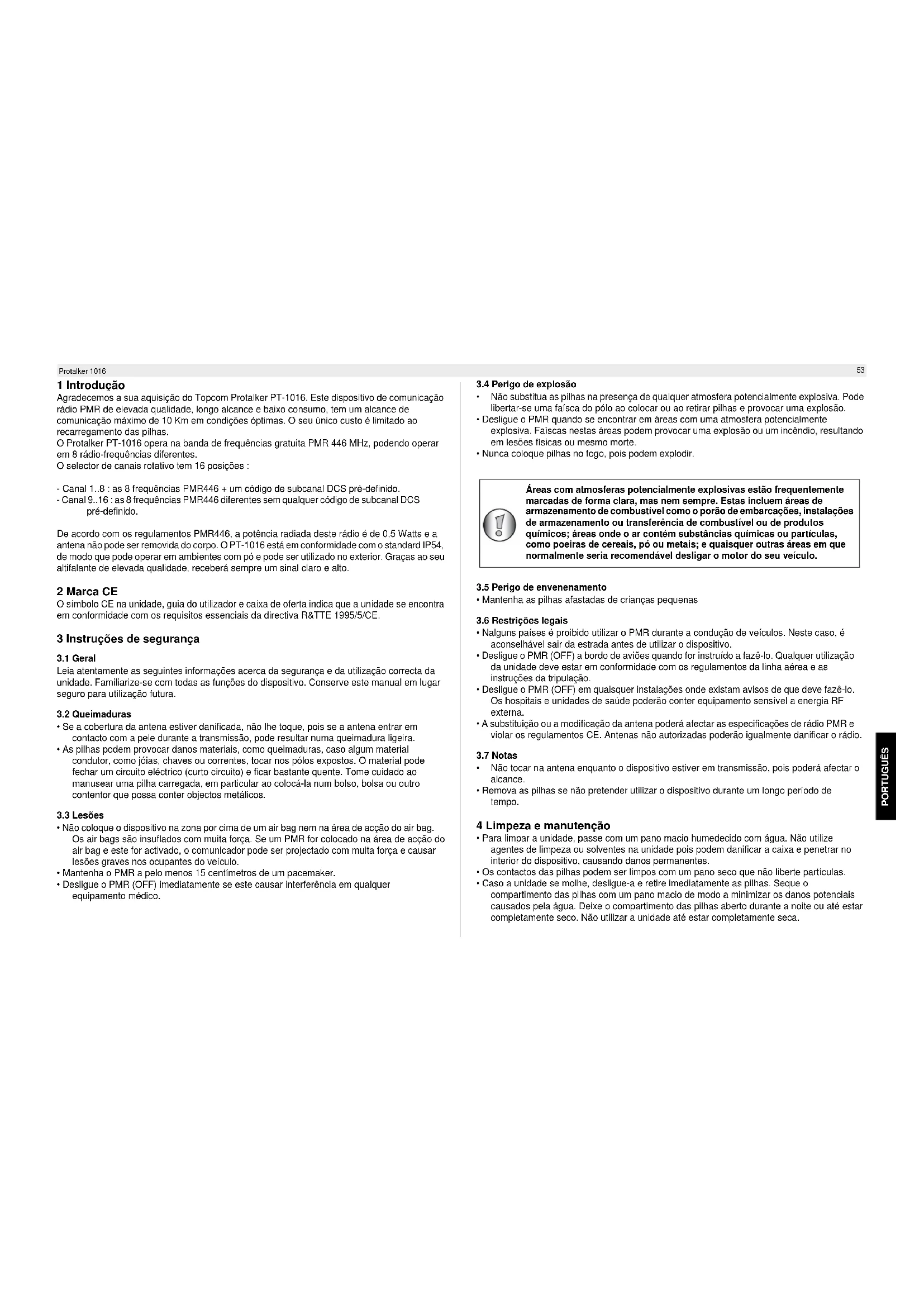 Protalker 1016 1 Introdução Agradecemos a sua aquisição do Topcom Protalker PT-1016. Este dispositivo de comunicação rádio PMR de elevada qualidade, longo alcance e baixo consumo, tem um alcance de comunicação máximo de 10 Km em condições óptimas. O seu único custo é limitado ao recarregamento das pilhas. O Protalker PT-1016 opera na banda de frequências gratuita PMR 446 MHz, podendo operar em 8 rádio-frequências diferentes. O selector de canais rotativo tem 16 posições : - Canal 1..8 : as 8 frequências PMR446 + um código de subcanal DCS pré-definido. - Canal 9..16 : as 8 frequências PMR446 diferentes sem qualquer código de subcanal DCS pré-definido. De acordo com os regulamentos PMR446, a potência radiada deste rádio é de 0,5 Watts e a antena não pode ser removida do corpo. O PT-1016 está em conformidade com o standard IP54, de modo que pode operar em ambientes com pó e pode ser utilizado no exterior. Graças ao seu altifalante de elevada qualidade, receberá sempre um sinal claro e alto. 2 Marca CE O símbolo CE na unidade, guia do utilizador e caixa de oferta indica que a unidade se encontra em conformidade com os requisitos essenciais da directiva R&TTE 1995/5/CE. 3 Instruções de segurança