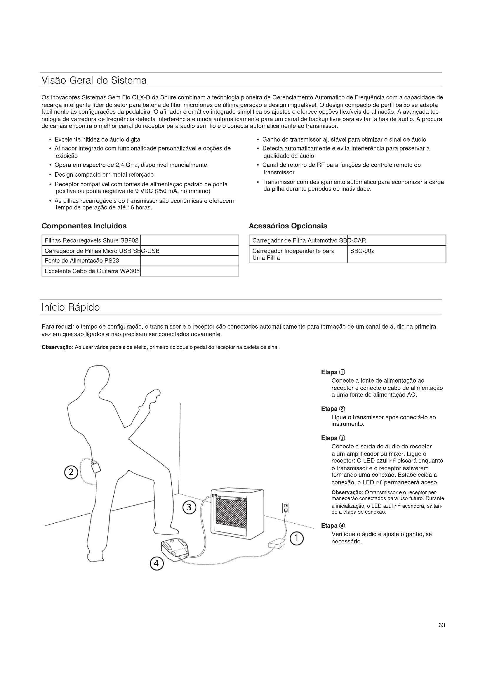 Visão Geral do Sistema Os inovadores Sistemas Sem Fio GLX-D da Shure combinam a tecnologia pioneira de Gerenciamento Automático de Frequência com a capacidade de recarga inteligente líder do setor para bateria de lítio, microfones de última geração e design inigualável. O design compacto de perfil baixo se adapta facilmente às configurações da pedaleira. O afinador cromático integrado simplifica os ajustes e oferece opções flexíveis de afinação. A avançada tec- nologia de varredura de frequência detecta interferência e muda automaticamente para um canal de backup livre para evitar falhas de áudio. A procura de canais encontra o melhor canal do receptor para áudio sem fio e o conecta automaticamente ao transmissor.