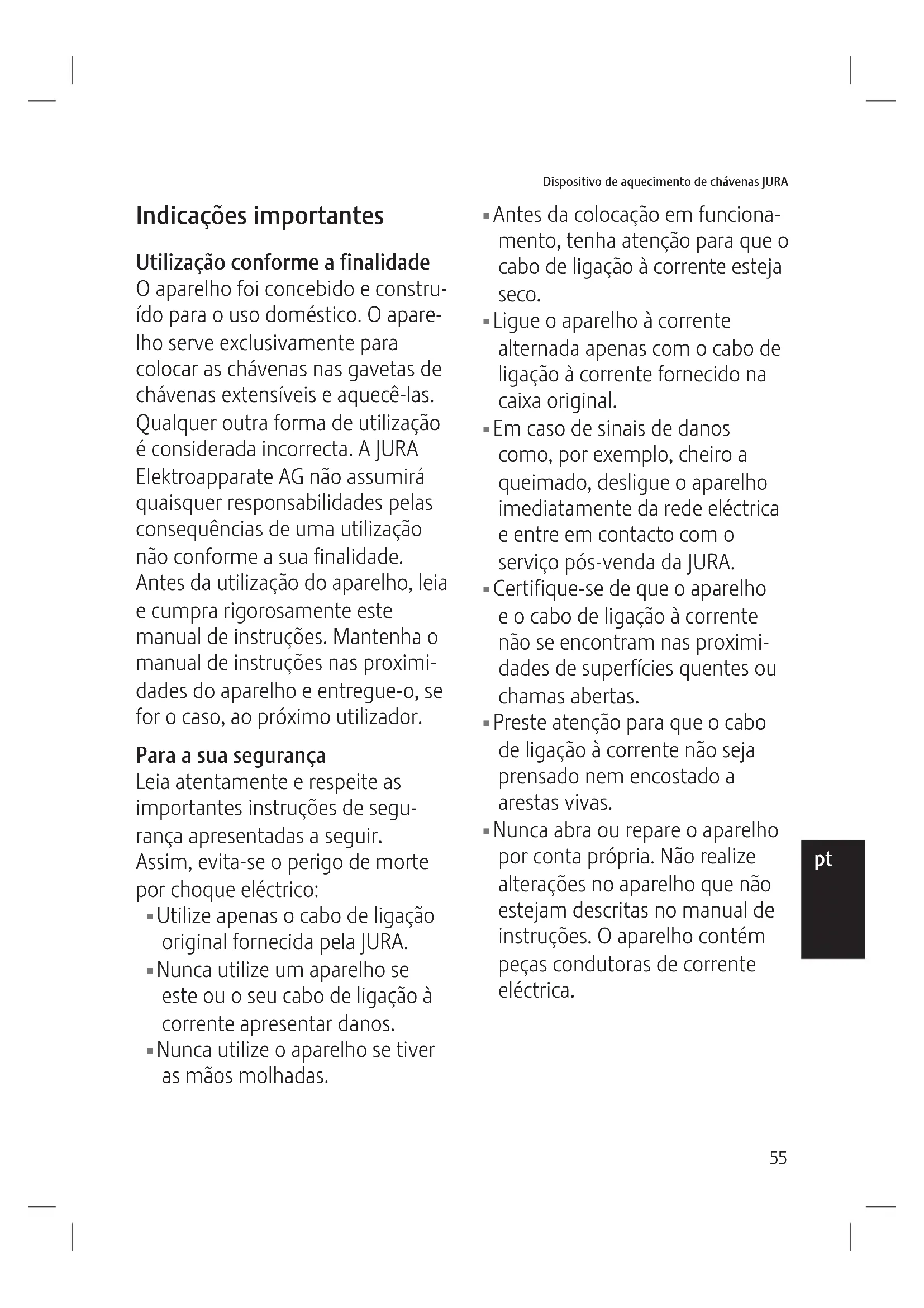 Elementos de comando55 Dispositivo de aquecimento de chávenas JURA Indicações importantes Utilização conforme a finalidade O aparelho foi concebido e constru- ído para o uso doméstico. O apare- lho serve exclusivamente para colocar as chávenas nas gavetas de chávenas extensíveis e aquecê-las. Qualquer outra forma de utilização é considerada incorrecta. A JURA Elektroapparate AG não assumirá quaisquer responsabilidades pelas consequências de uma utilização não conforme a sua finalidade. Antes da utilização do aparelho, leia e cumpra rigorosamente este manual de instruções. Mantenha o manual de instruções nas proximi- dades do aparelho e entregue-o, se for o caso, ao próximo utilizador. Para a sua segurança Leia atentamente e respeite as importantes instruções de segu- rança apresentadas a seguir. Assim, evita-se o perigo de morte por choque eléctrico: Z Utilize apenas o cabo de ligação original fornecida pela JURA. Z Nunca utilize um aparelho se este ou o seu cabo de ligação à corrente apresentar danos. Z Nunca utilize o aparelho se tiver as mãos molhadas. Z Antes da colocação em funciona- mento, tenha atenção para que o cabo de ligação à corrente esteja seco. Z Ligue o aparelho à corrente alternada apenas com o cabo de ligação à corrente fornecido na caixa original. Z Em caso de sinais de danos como, por exemplo, cheiro a queimado, desligue o aparelho imediatamente da rede eléctrica e entre em contacto com o serviço pós-venda da JURA. Z Certifique-se de que o aparelho e o cabo de ligação à corrente não se encontram nas proximi- dades de superfícies quentes ou chamas abertas. Z Preste atenção para que o cabo de ligação à corrente não seja prensado nem encostado a arestas vivas. Z Nunca abra ou repare o aparelho por conta própria. Não realize alterações no aparelho que não estejam descritas no manual de instruções. O aparelho contém peças condutoras de corrente eléctrica.