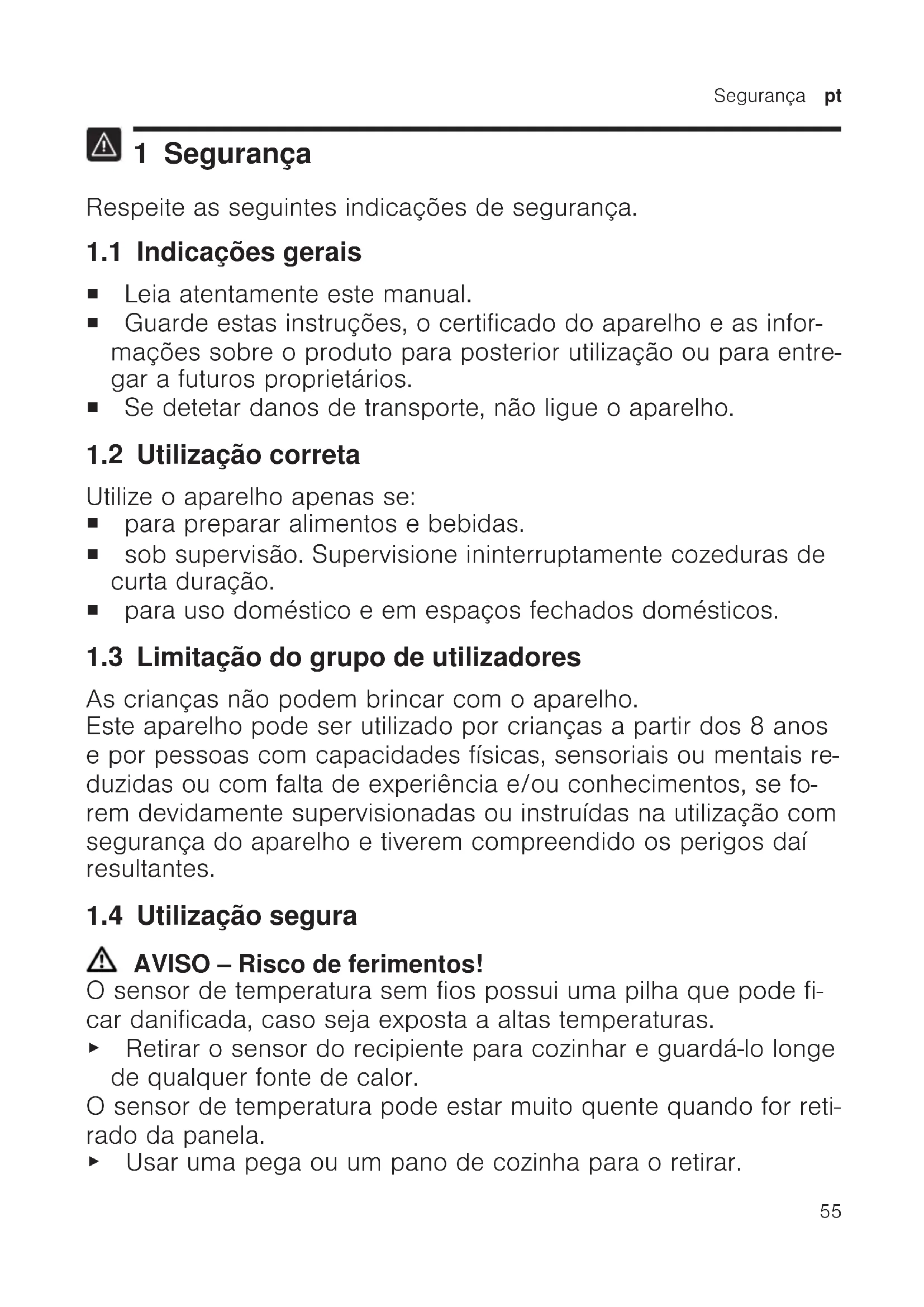 1 Segurança Respeite as seguintes indicações de segurança. 1.1 Indicações gerais ¡ Leia atentamente este manual. ¡ Guarde estas instruções, o certificado do aparelho e as infor- mações sobre o produto para posterior utilização ou para entre- gar a futuros proprietários. ¡ Se detetar danos de transporte, não ligue o aparelho. 1.2 Utilização correta Utilize o aparelho apenas se: ¡ para preparar alimentos e bebidas. ¡ sob supervisão. Supervisione ininterruptamente cozeduras de curta duração. ¡ para uso doméstico e em espaços fechados domésticos. 1.3 Limitação do grupo de utilizadores As crianças não podem brincar com o aparelho. Este aparelho pode ser utilizado por crianças a partir dos 8 anos e por pessoas com capacidades físicas, sensoriais ou mentais re- duzidas ou com falta de experiência e/ou conhecimentos, se fo- rem devidamente supervisionadas ou instruídas na utilização com segurança do aparelho e tiverem compreendido os perigos daí resultantes. 1.4 Utilização segura AVISO‒Risco de ferimentos! O sensor de temperatura sem fios possui uma pilha que pode fi- car danificada, caso seja exposta a altas temperaturas. ▶ Retirar o sensor do recipiente para cozinhar e guardá-lo longe de qualquer fonte de calor. O sensor de temperatura pode estar muito quente quando for reti- rado da panela. ▶ Usar uma pega ou um pano de cozinha para o retirar.pt Segurança