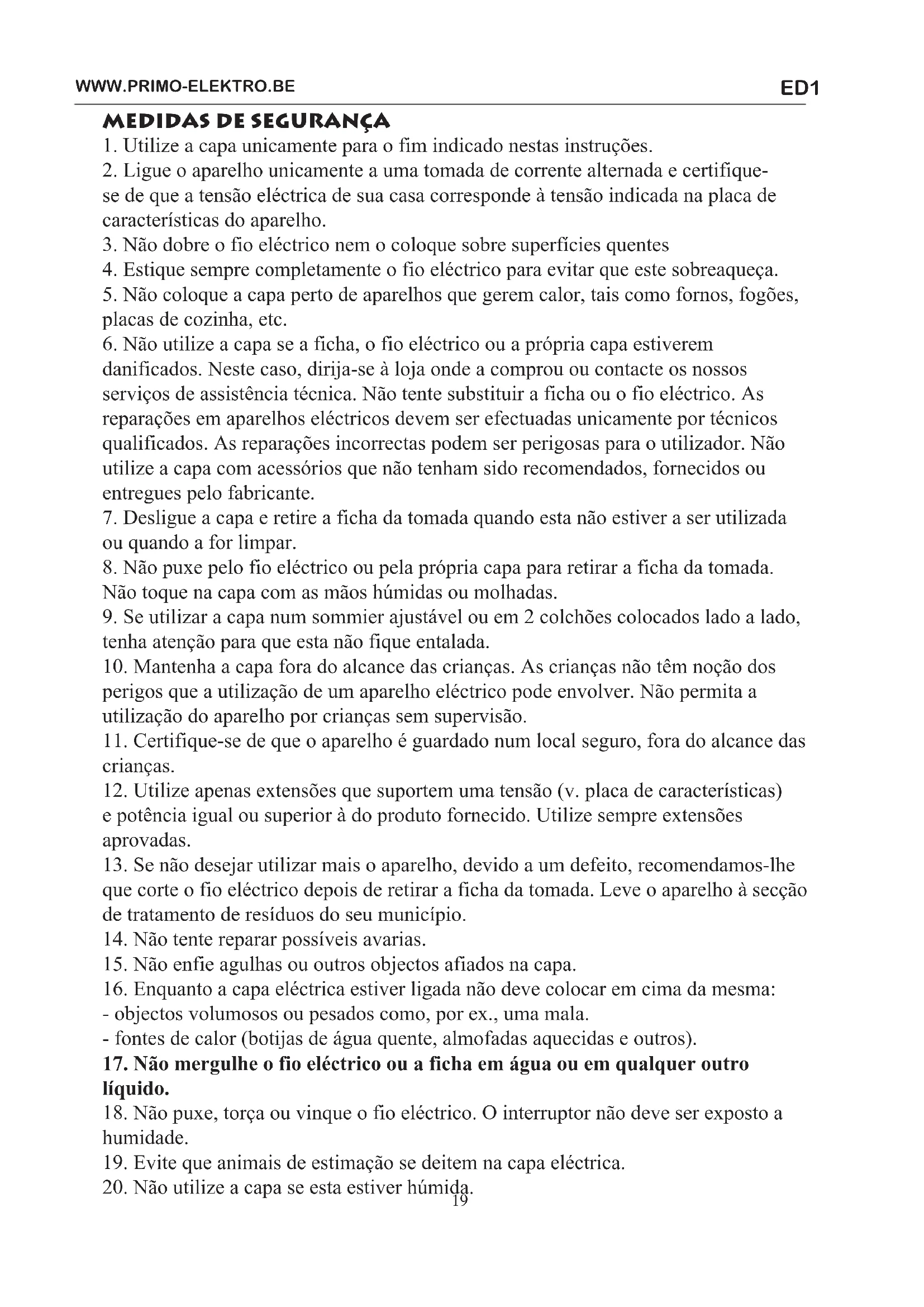 ED1 - Cobertor elétrico aquecedor PRIMO - Manual de utilização gratuito