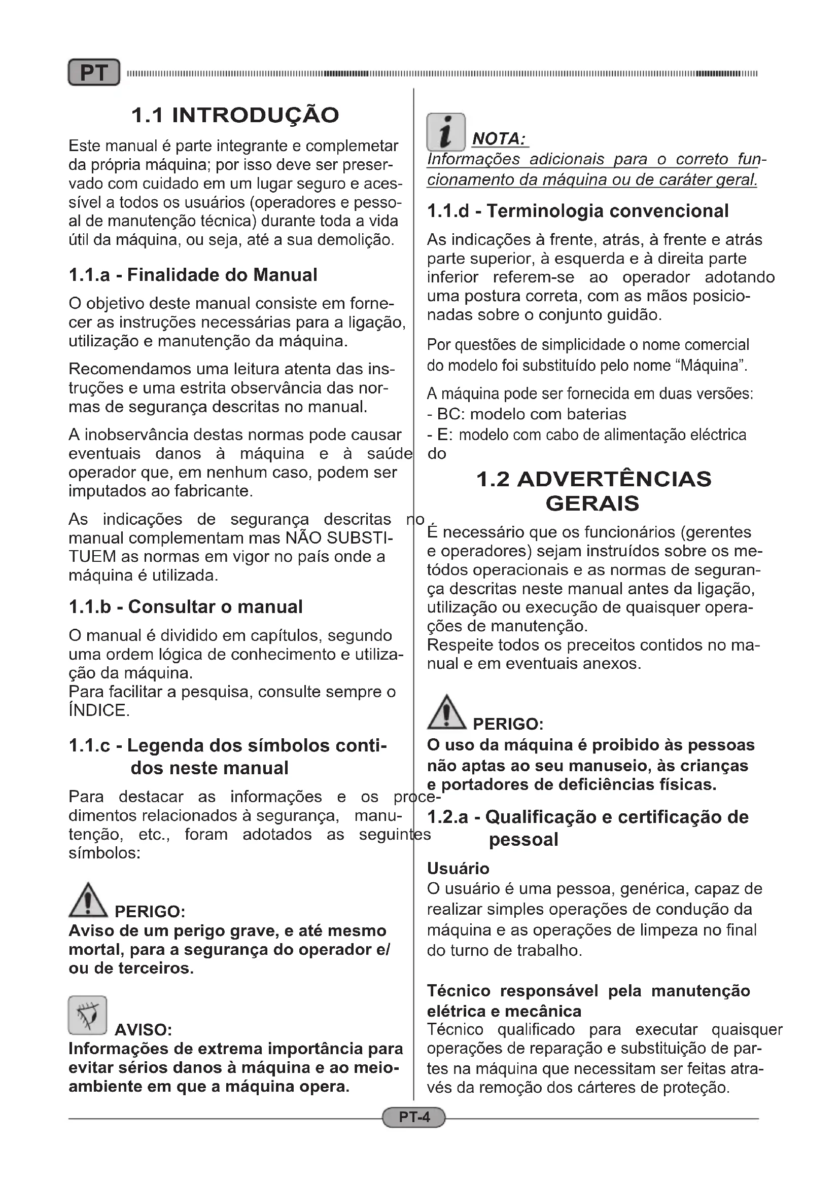 dos neste manual Para destacar as informações e os proce- dimentosrelacionadosàsegurança, manu- tenção, etc., foram adotados as seguintes símbolos: PERIGO: Aviso de um perigo grave, e até mesmo mortal, para a segurança do operador e/ ou de terceiros. AVISO: Informações de extrema importância para evitar sérios danos à máquina e ao meio- ambiente em que a máquina opera. NOTA: Informações adicionais para o correto fun- cionamento da máquina ou de caráter geral.