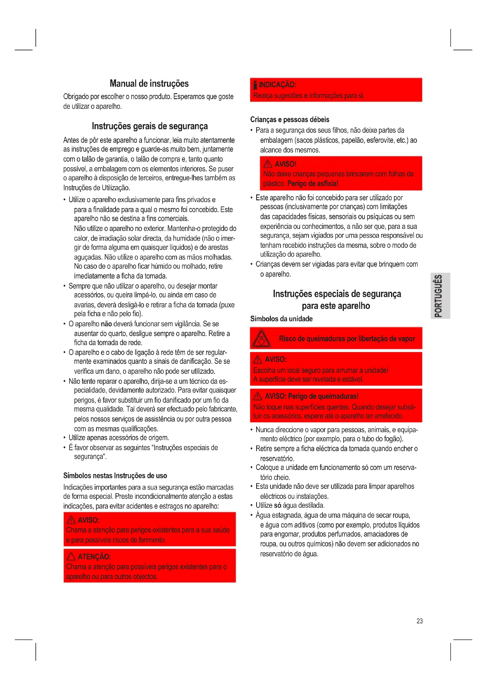 - É favor observar as seguintes “Instruções especiais de segurança“. Símbolos nestas Instruções de uso Indicações importantes para a sua segurança estão marcadas de forma especial. Preste incondicionalmente atenção a estas indicações, para evitar acidentes e estragos no aparelho: AVISO: Chama a atenção para perigos existentes para a sua saúde e para possíveis riscos de ferimento. ATENÇÃO: Chama a atenção para possíveis perigos existentes para o aparelho ou para outros objectos. INDICAÇÃO: Realça sugestões e informações para si. Crianças e pessoas débeis