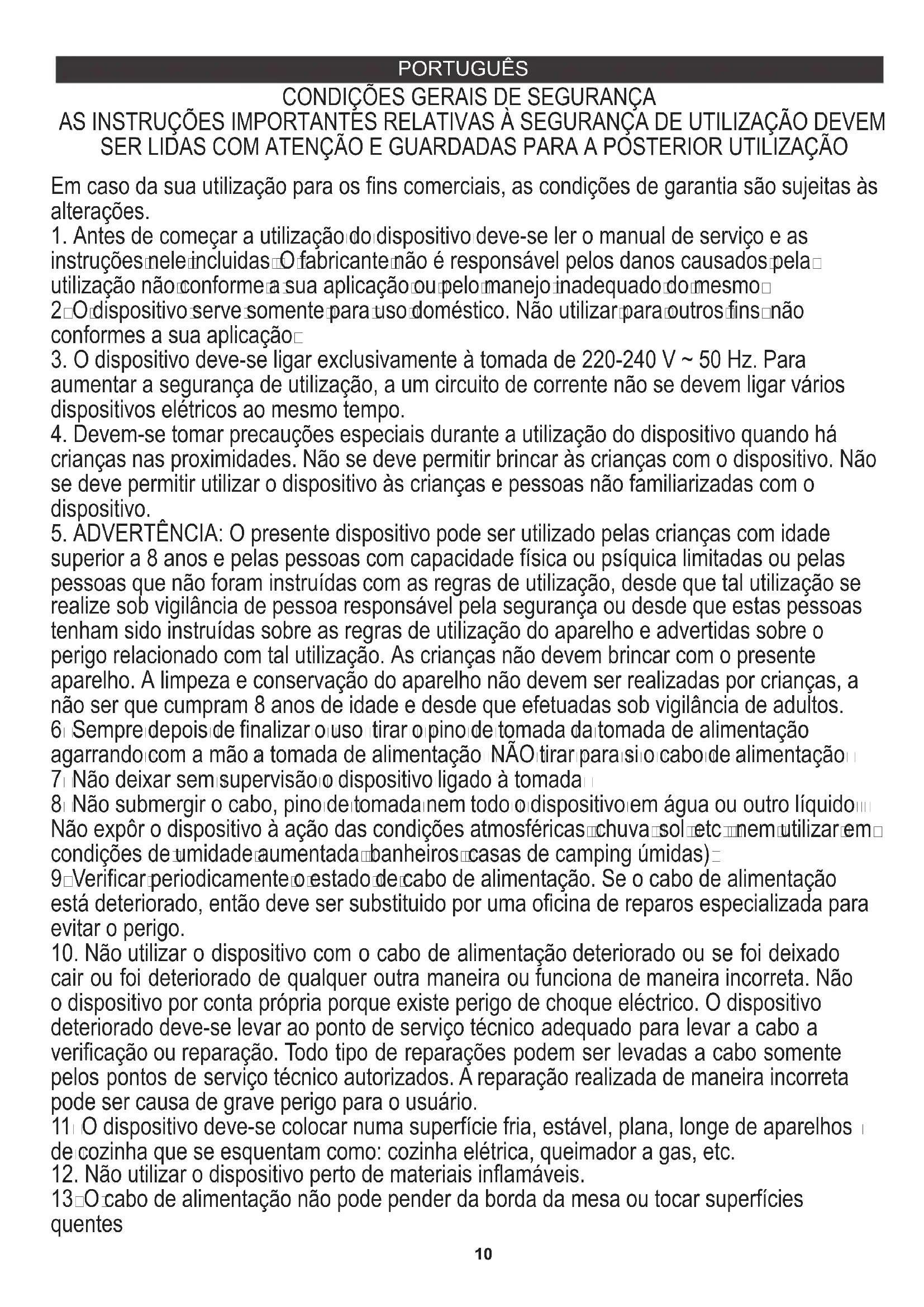 10. Não utilizar o dispositivo com o cabo de alimentação deteriorado ou se foi deixado