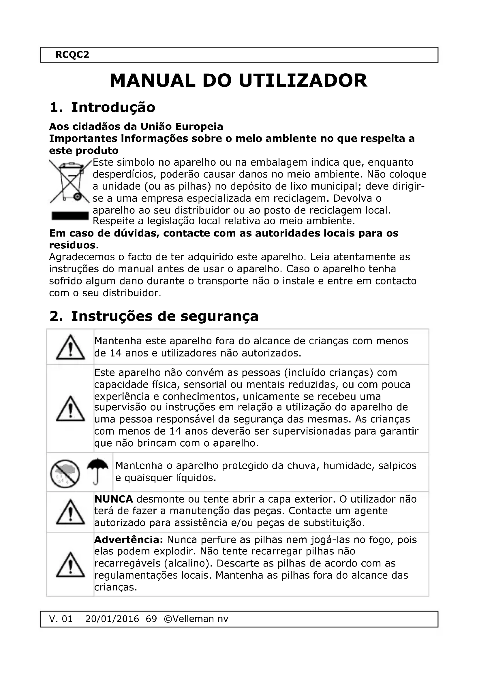 Encontre gratuitamente o manual do aparelho RCQC2 VELLEMAN em formato PDF.