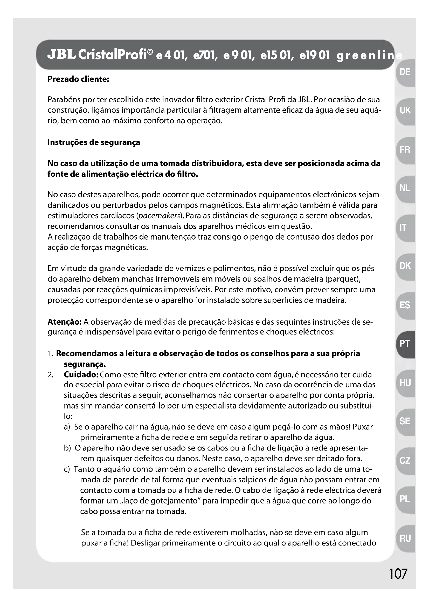 Número de serie _ _ - _ _- _ _ _ _ _ Fecha de compra: _ _ / _ _ / _ _ (por favor, es imperativo que adjunte el comprobante de compra, que le será devuelto con el aparato) Razón de la Reclamación: Fecha:................................................ Firma:................................................ Ponga aquí el comprobante107 Prezado cliente:Parabéns por ter escolhido este inovador filtro exterior Cristal Profi da JBL. Por ocasião de sua construção, ligámos importância particular à filtragem altamente eficaz da água de seu aquá-rio, bem como ao máximo conforto na operação.Instruções de segurançaNo caso da utilização de uma tomada distribuidora, esta deve ser posicionada acima da fonte de alimentação eléctrica do filtro.No caso destes aparelhos, pode ocorrer que determinados equipamentos electrónicos sejam danificados ou perturbados pelos campos magnéticos. Esta afirmação também é válida para estimuladores cardíacos (pacemakers). Para as distâncias de segurança a serem observadas, recomendamos consultar os manuais dos aparelhos médicos em questão.A realização de trabalhos de manutenção traz consigo o perigo de contusão dos dedos por acção de forças magnéticas.Em virtude da grande variedade de vernizes e polimentos, não é possível excluir que os pés do aparelho deixem manchas irremovíveis em móveis ou soalhos de madeira (parquet), causadas por reacções químicas imprevisíveis. Por este motivo, convém prever sempre uma protecção correspondente se o aparelho for instalado sobre superfícies de madeira.Atenção: A observação de medidas de precaução básicas e das seguintes instruções de se-gurança é indispensável para evitar o perigo de ferimentos e choques eléctricos: 1. Recomendamos a leitura e observação de todos os conselhos para a sua própria segurança.