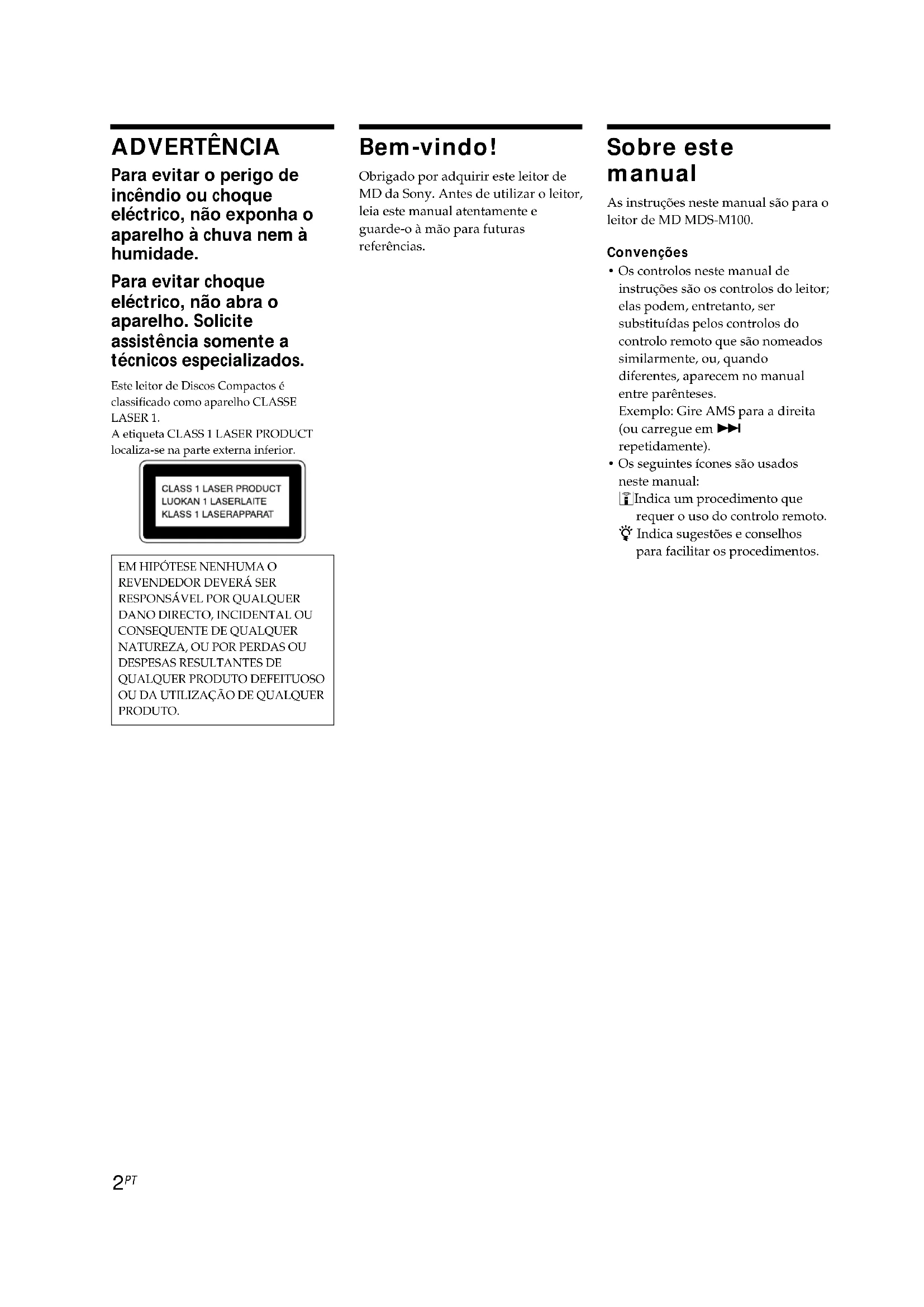 ADVERTÊNCIA Para evitar o perigo de incêndio ou choque eléctrico, não exponha o aparelho à chuva nem à humidade. Para evitar choque eléctrico, não abra o aparelho. Solicite assistência somente a técnicos especializados. Este leitor de Discos Compactos éclassificado como aparelho CLASSELASER 1.A etiqueta CLASS 1 LASER PRODUCTlocaliza-se na parte externa inferior.EM HIPÓTESE NENHUMA OREVENDEDOR DEVERÁ SERRESPONSÁVEL POR QUALQUERDANO DIRECTO, INCIDENTAL OUCONSEQUENTE DE QUALQUERNATUREZA, OU POR PERDAS OUDESPESAS RESULTANTES DEQUALQUER PRODUTO DEFEITUOSOOU DA UTILIZAÇÃO DE QUALQUERPRODUTO. Bem-vindo! Obrigado por adquirir este leitor de MD da Sony. Antes de utilizar o leitor, leia este manual atentamente e guarde-o à mão para futuras referências. Sobre este manual As instruções neste manual são para o leitor de MD MDS-M100. Convenções