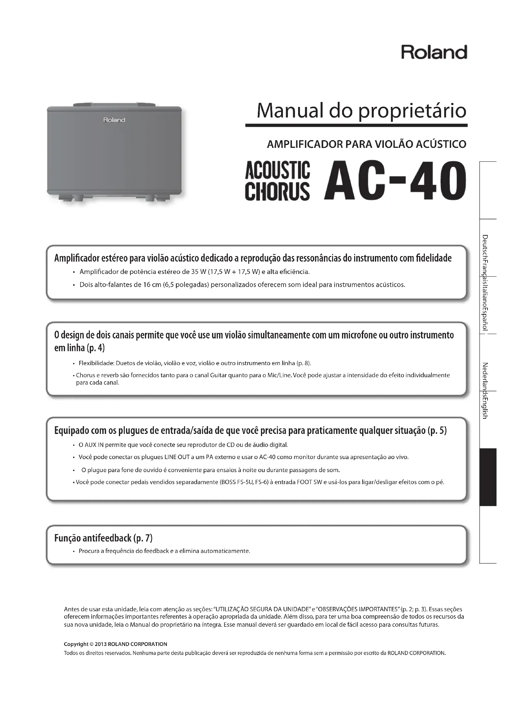 STEREO EFFECTS CHORUSREVERBCHORUSREVERBMIC/LINE CHANNELTREBLEMIDDLEBASSVOLUMEGUITAR CHANNELTREBLEMIDDLEBASSVOLUMEREVERB ON/OFFCHORUS ON/OFFFOOT SWEFFECTS Solução de problemas10 Roland AC-40: AMPLIFICADOR PARA VIOLÃO ACÚSTICO Saída de potência nominal 35 W (17,5 W + 17,5 W) Nível de entrada nominal (1 kHz) GUITAR CHANNEL: MIC/LINE CHANNEL: AUX IN: -10 dBu -50 dBu/-20 dBu -10 dBu Nível de saída nominal (1 kHz) LINE OUT: -10 dBu Alto-falantes 16 cm (6,5 polegadas) x 2 Controles GUITAR CHANNEL: Botão VOLUME, botão BASS, botão MIDDLE, botão TREBLE, chave CHORUS (OFF, SPACE, WIDE), botão REVERB MIC/LINE CHANNEL: Botão VOLUME, botão BASS, botão MIDDLE, botão TREBLE, chave CHORUS (OFF, SPACE, WIDE), botão REVERB ANTI-FEEDBACK: Chave ON/OFF AUX IN: Botão LEVEL Outros: Botão MASTER, chave POWER Indicador POWER Conectores Plugue GUITAR CHANNEL INPUT: Tipo fone de 1/4 de polegada Plugue MIC/LINE CHANNEL INPUT: Tipo XLR, tipo fone TRS de 1/4 de polegada AUX IN: Tipo fone miniatura estéreo Plugues LINE OUT (L/MONO, R): Tipo fone de 1/4 de polegada Plugue PHONES: Tipo fone miniatura estéreo Plugue FOOT SW: Tipo fone TRS de 1/4 de polegada Plugue DC IN Fonte de alimentação Adaptador CA Consumo 480 mA Dimensões 362 (L) x 241 (P) x 265 (A) mm Peso 5.3 kg Acessórios Manual do proprietário, adaptador CA, cabo de força Opcionais (vendidos separadamente) Pedal: BOSS FS-5U, FS-6