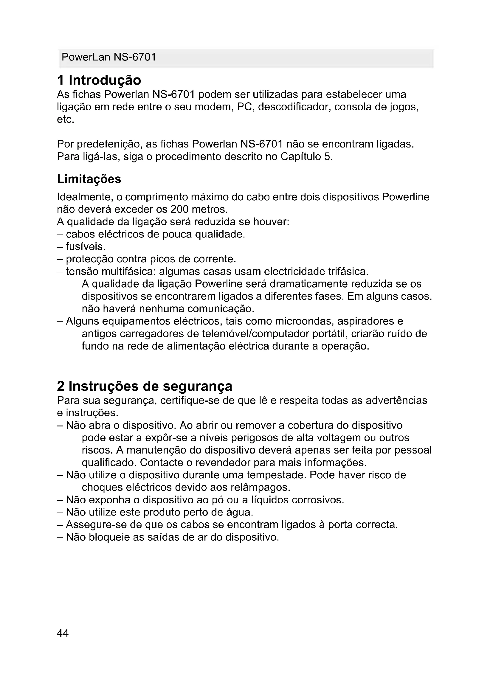 1 Introdução As fichas Powerlan NS-6701 podem ser utilizadas para estabelecer uma ligação em rede entre o seu modem, PC, descodificador, consola de jogos, etc. Por predefenição, as fichas Powerlan NS-6701 não se encontram ligadas. Para ligá-las, siga o procedimento descrito no Capítulo 5. Limitações Idealmente, o comprimento máximo do cabo entre dois dispositivos Powerline não deverá exceder os 200 metros. A qualidade da ligação será reduzida se houver: – cabos eléctricos de pouca qualidade. – fusíveis. – protecção contra picos de corrente. – tensão multifásica: algumas casas usam electricidade trifásica. A qualidade da ligação Powerline será dramaticamente reduzida se os dispositivos se encontrarem ligados a diferentes fases. Em alguns casos, não haverá nenhuma comunicação. – Alguns equipamentos eléctricos, tais como microondas, aspiradores e antigos carregadores de telemóvel/computador portátil, criarão ruído de fundo na rede de alimentação eléctrica durante a operação. 2 Instruções de segurança Para sua segurança, certifique-se de que lê e respeita todas as advertências e instruções. – Não abra o dispositivo. Ao abrir ou remover a cobertura do dispositivo pode estar a expôr-se a níveis perigosos de alta voltagem ou outros riscos. A manutenção do dispositivo deverá apenas ser feita por pessoal qualificado. Contacte o revendedor para mais informações. – Não utilize o dispositivo durante uma tempestade. Pode haver risco de choques eléctricos devido aos relâmpagos. – Não exponha o dispositivo ao pó ou a líquidos corrosivos. – Não utilize este produto perto de água. – Assegure-se de que os cabos se encontram ligados à porta correcta. – Não bloqueie as saídas de ar do dispositivo.PowerLan NS-6701