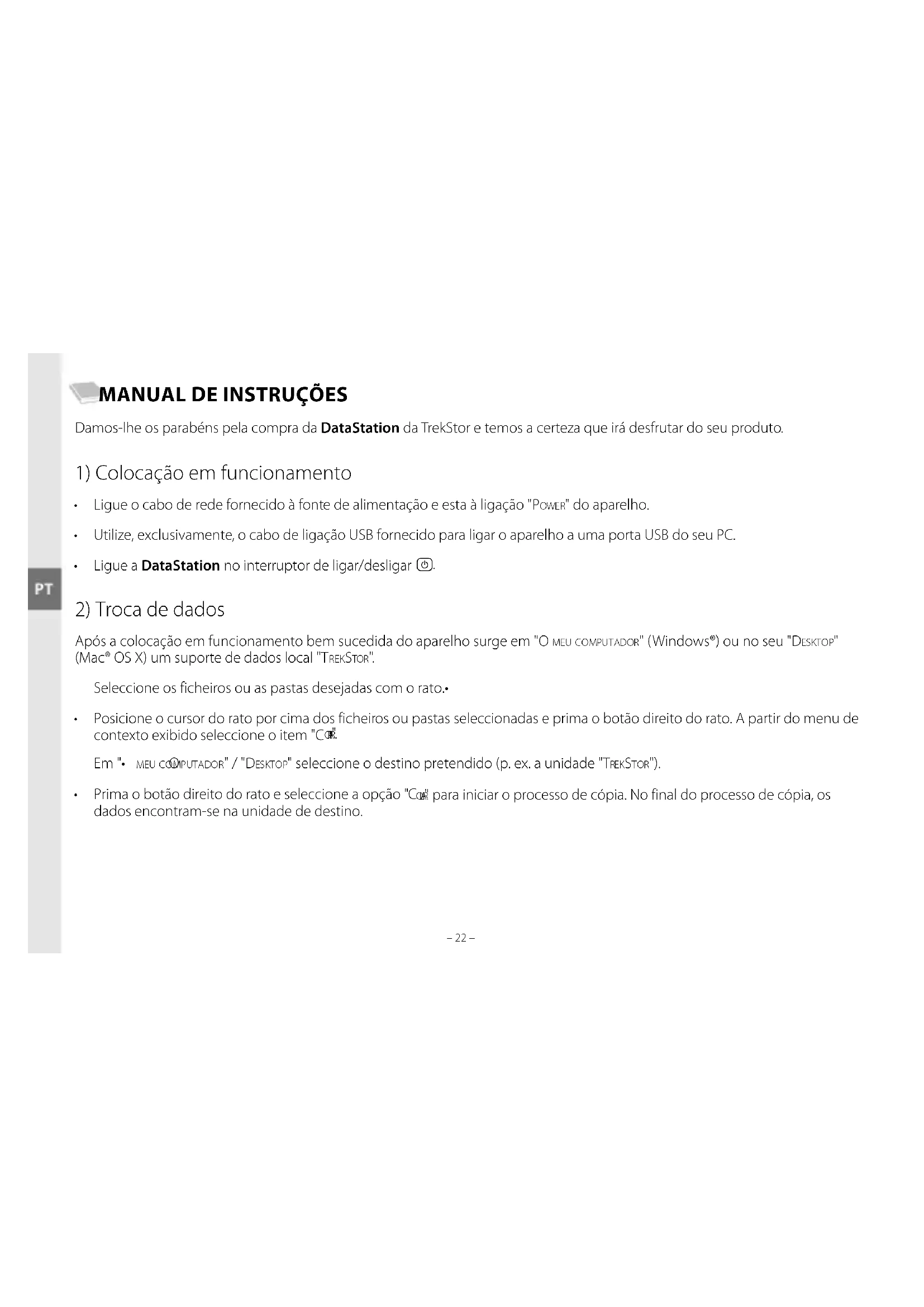 Após a colocação em funcionamento bem sucedida do aparelho surge em "o M e u c o M p u t A D o r " (Windows®) ou no seu "De s k t o p " (Mac® OS X) um suporte de dados local "t r e k st o r ". Seleccione os ficheiros ou as pastas desejadas com o rato.• Posicione o cursor do rato por cima dos ficheiros ou pastas seleccionadas e prima o botão direito do rato. A partir do menu de • contexto exibido seleccione o item "c o p i A r ". Em "• o M e u c o M p u t A D o r " / "De s k t o p " seleccione o destino pretendido (p. ex. a unidade "tr e k st o r "). Prima o botão direito do rato e seleccione a opção "• c o l A r " para iniciar o processo de cópia. No final do processo de cópia, os dados encontram-se na unidade de destino.– 22 – – 23 –