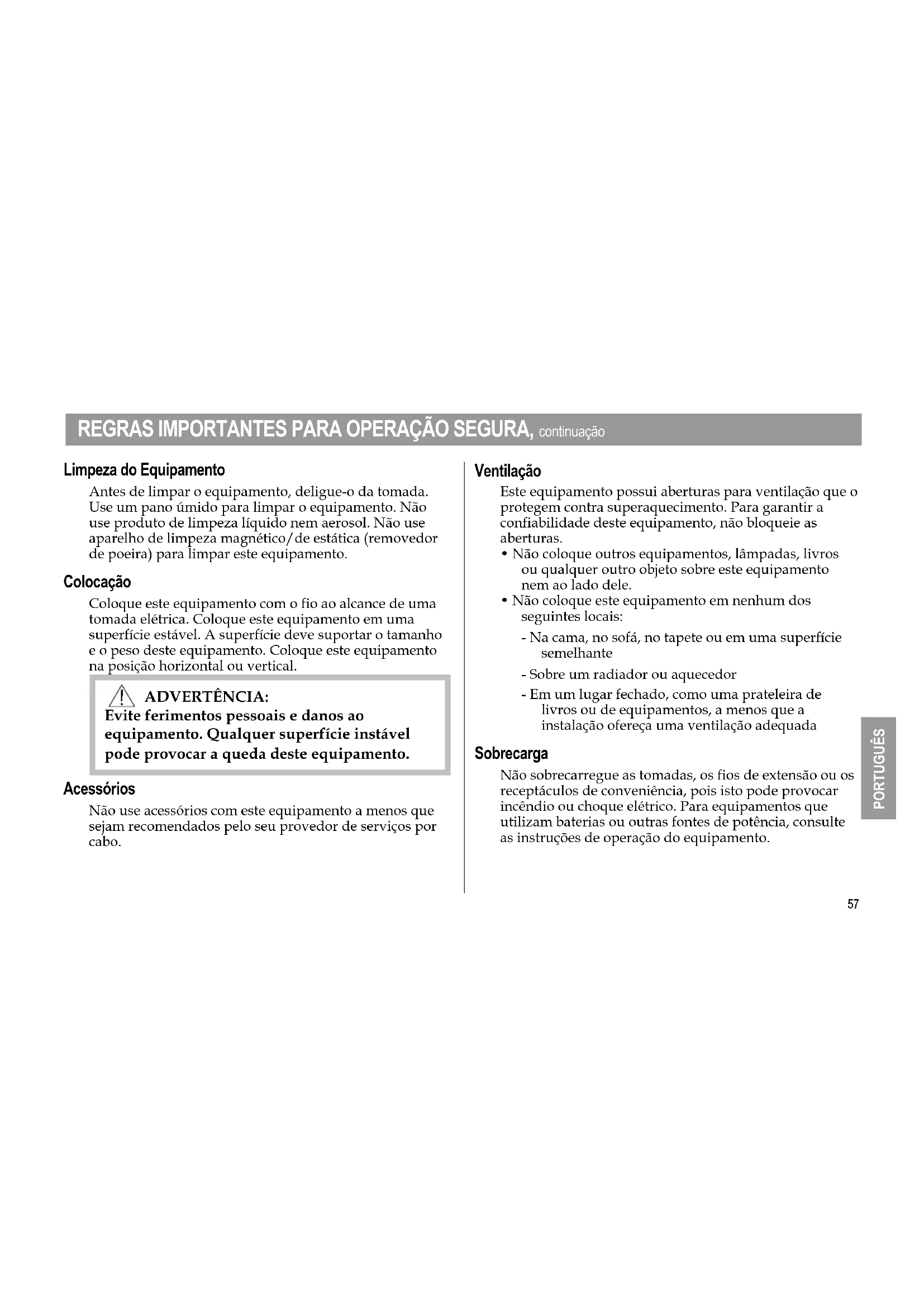 - Não coloque outros equipamentos, lâmpadas, livros ou qualquer outro objeto sobre este equipamento nem ao lado dele.