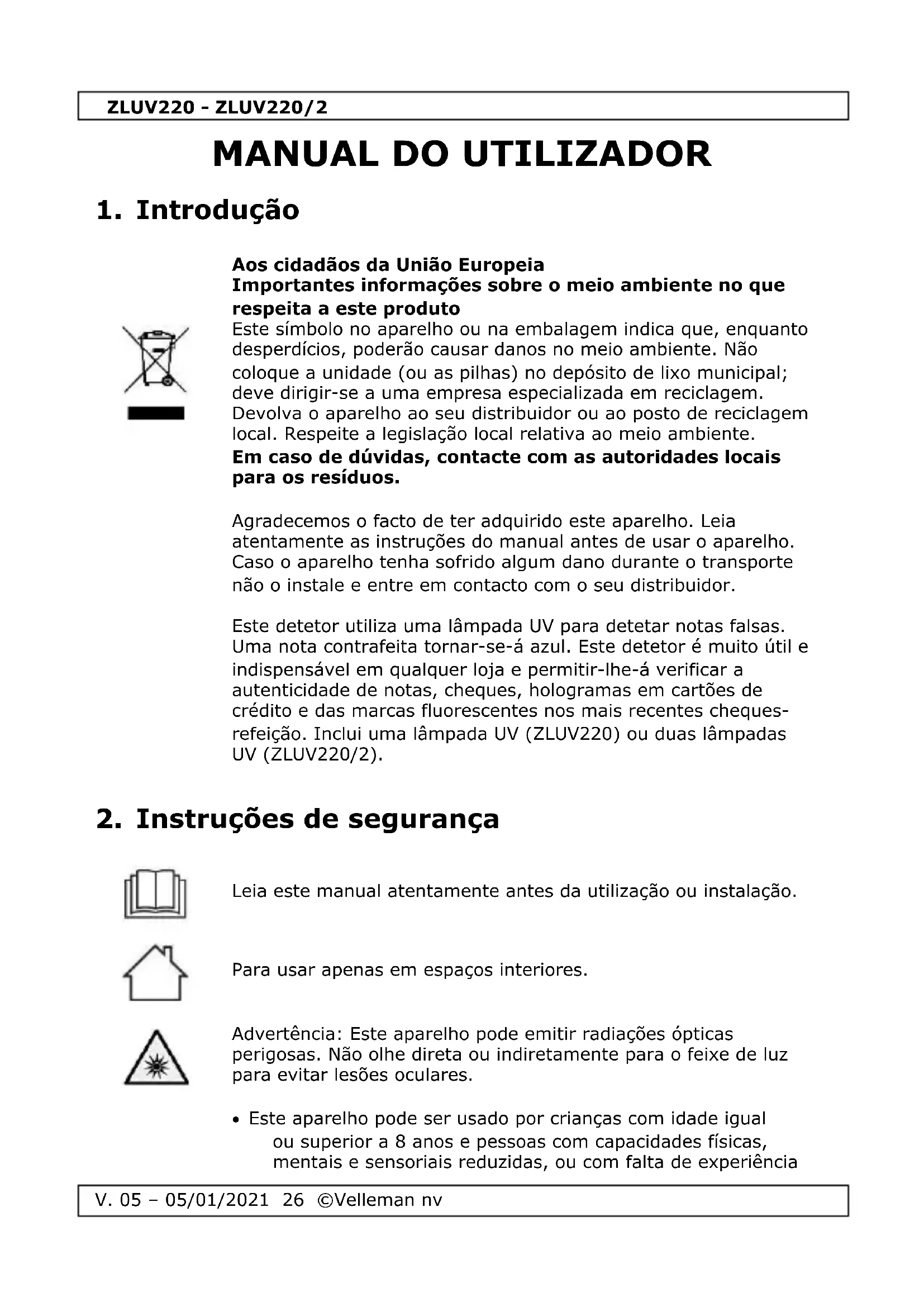 Baixe as instruções para o seu Detetor em formato PDF gratuitamente! Encontre o seu manual ZLUV2202 - VELLEMAN e retome o controlo do seu dispositivo eletrónico. Nesta página estão publicados todos os documentos necessários para a utilização do seu dispositivo. ZLUV2202 da marca VELLEMAN.