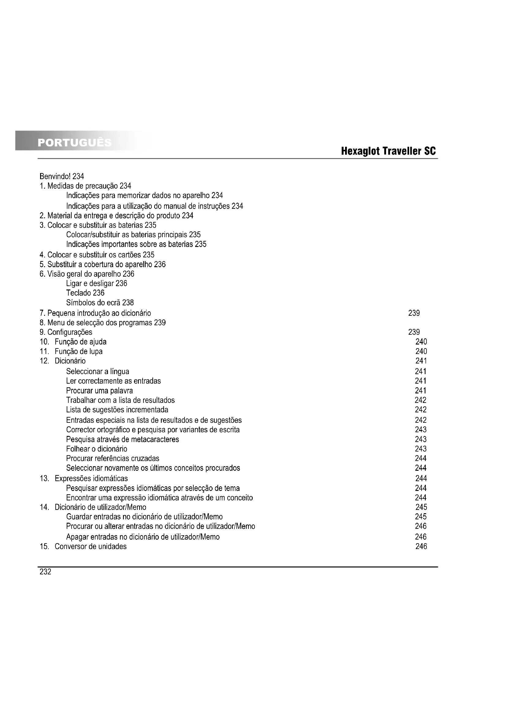 PORTUGUÊS Benvindo! Muito obrigado por ter escolhido o Hexaglot Traveller SC. Por favor, reserve alguns minutos para a leitura cuidada e integral deste manual de instruções, antes da primeira utilização, para que possa usufruir de todas as funções deste aparelho durante muitos anos. Por favor, conserve este manual de instruções de forma adequada, de forma a permitir-lhe consultas posteriores. A Hexaglot deseja-lhe muito sucesso na utilização do seu Hexaglot Traveller SC!