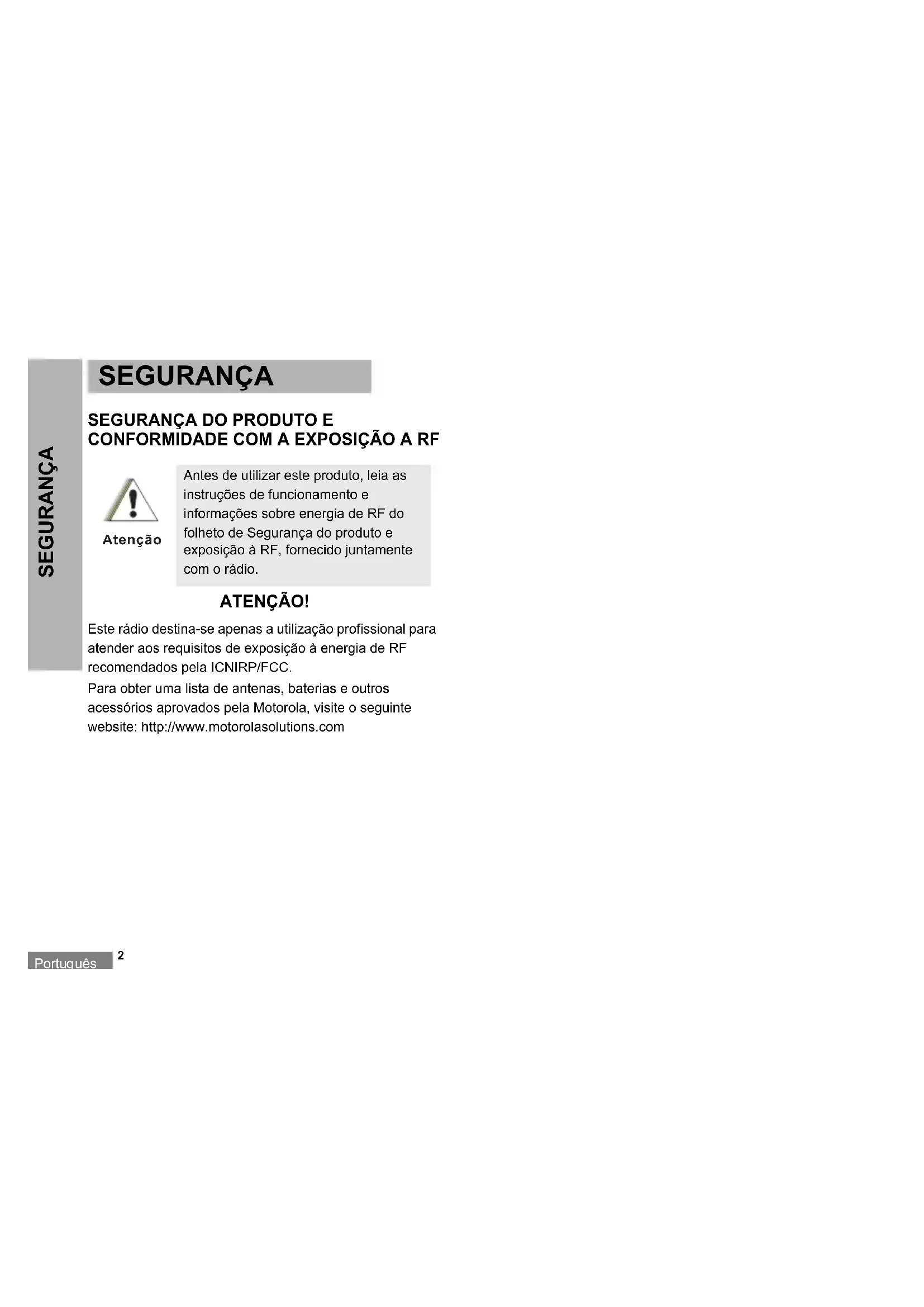 CONFORMIDADE COM A EXPOSIÇÃO A RF ATENÇÃO! Este rádio destina-se apenas a utilização profissional para atender aos requisitos de exposição à energia de RF recomendados pela ICNIRP/FCC. Para obter uma lista de antenas, baterias e outros acessórios aprovados pela Motorola, visite o seguinte website: http://www.motorolasolutions.com Antes de utilizar este produto, leia as instruções de funcionamento e informações sobre energia de RF do folheto de Segurança do produto e exposição à RF, fornecido juntamente com o rádio. AtençãoPortu