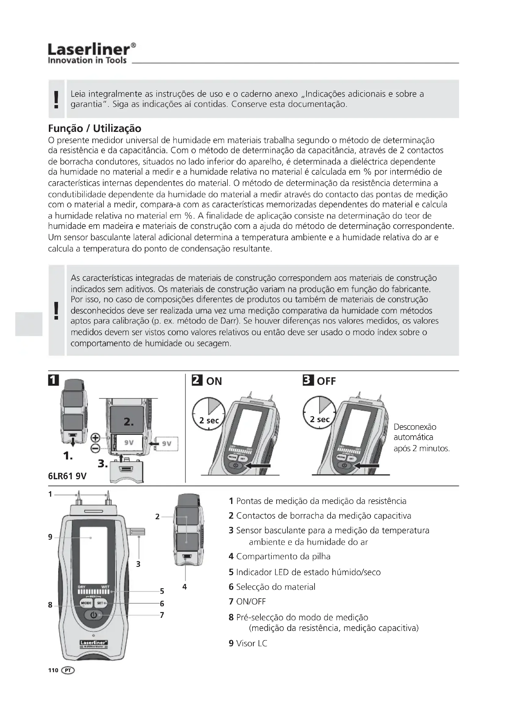 Função / Utilização O presente medidor universal de humidade em materiais trabalha segundo o método de determinação da resistência e da capacitância. Com o método de determinação da capacitância, através de 2 contactos de borracha condutores, situados no lado inferior do aparelho, é determinada a dieléctrica dependente da humidade no material a medir e a humidade relativa no material é calculada em % por intermédio de características internas dependentes do material. O método de determinação da resistência determina a condutibilidade dependente da humidade do material a medir através do contacto das pontas de medição com o material a medir, compara-a com as características memorizadas dependentes do material e calcula a humidade relativa no material em %. A Ö nalidade de aplicação consiste na determinação do teor de humidade em madeira e materiais de construção com a ajuda do método de determinação correspondente. Um sensor basculante lateral adicional determina a temperatura ambiente e a humidade relativa do ar e calcula a temperatura do ponto de condensação resultante. Leia integralmente as instruções de uso e o caderno anexo „Indicações adicionais e sobre a garantia“. Siga as indicações aí contidas. Conserve esta documentação.