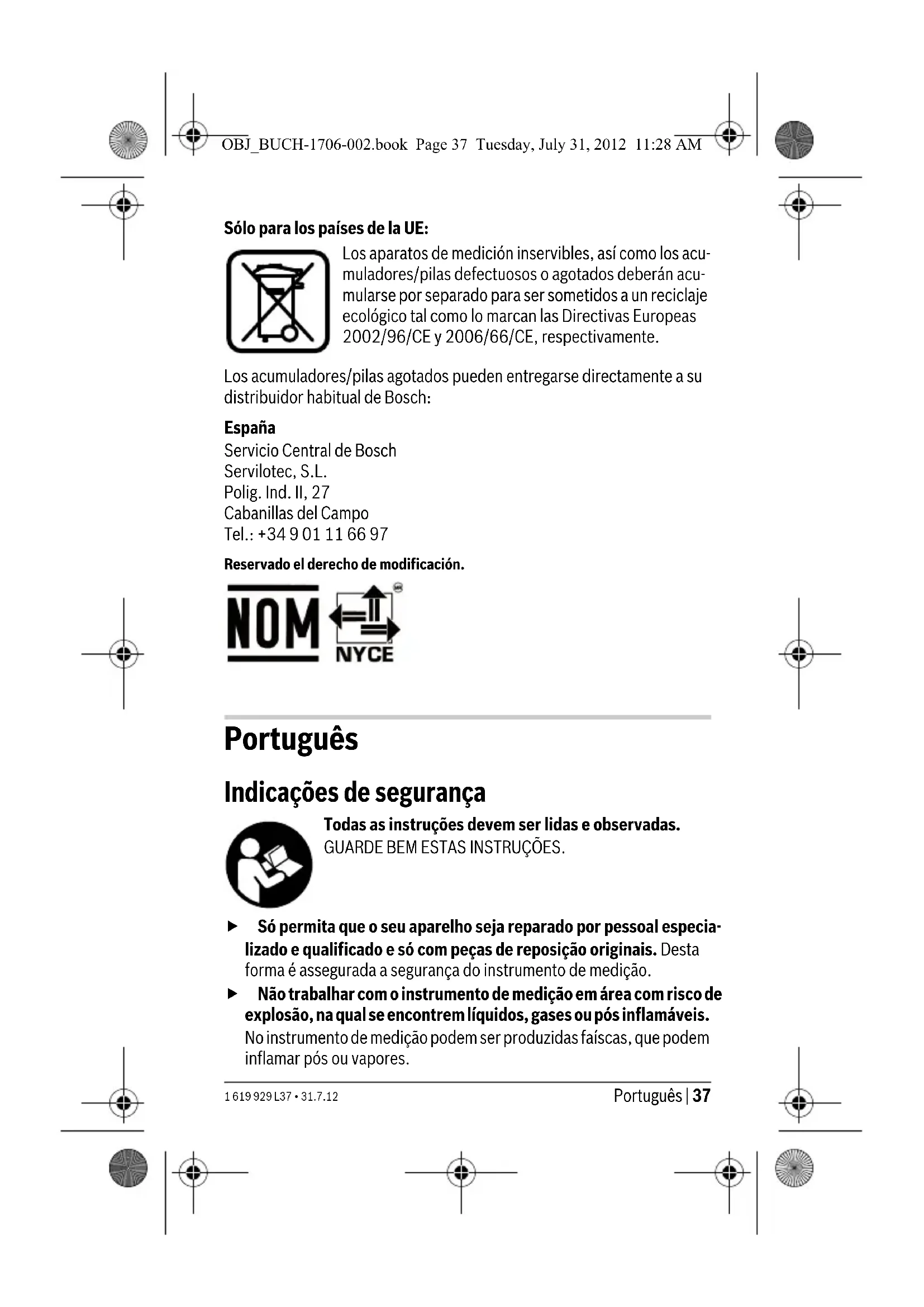 - reduzida profundidade de detecção no caso de cabos neutro ou terra f Dependendo do material e do tamanho dos objetos, assim como dos materiais e da condição do substrato, o resultado da medição pode ser pior em termos de precisão de exatidão e de detecção de profundidade. OBJ_BUCH-1706-002.book Page 39 Tuesday, July 31, 2012 11:28 AM40 | Português 1 619 929 L37 • 31.7.12 Funcionamento Colocação em funcionamento f Proteger o instrumento de medição contra humidade ou sol direto. f Não sujeitar o instrumento de medição a temperaturas extremas nem a oscilações de temperatura. Não deixá-lo p.ex. dentro de um automóvel durante muito tempo. No caso de grandes variações de temperatura deverá deixar o instrumento de medição alcançar a tem- peratura de funcionamento antes de colocá-lo em funcionamento. No caso de temperaturas ou de oscilações de temperatura extremas é possível que a precisão do instrumento de medição seja prejudicada. f Evitar que instrumento de medição sofra fortes golpes ou quedas. Ligar e desligar f Antes de ligar o instrumento de medição, deverá assegurar-se de que a área do sensor 7 não esteja húmida. Se necessário, deverá secar o instrumento de medição com um pano. Para ligar o instrumento de medição, deverá pressionar o tecla de ligar- desligar 4. O instrumento de medição está pronto para funcionar após um curto teste automático. A prontidão de funcionamento é indicada por um gancho atrás da indicação de calibração “AutoCal” d. Pressionar a tecla de ligar-desligar 4 para desligar o instrumento de me- dição. Após aprox. 10 min. sem executar uma medição, o instrumento de medi- ção desliga-se automaticamente para poupar a pilha. f Antes de furar, serrar ou fresar na parede, deve se precaver por meio de outras fontes de informação, para não correr perigo. Como os resultados de medição podem ser influenciados por condi- ções ambientais ou pela estrutura da parede, pode haver perigo, ape- sar de não ser indicado nenhum objeto na área do sensor (a luz de sinalização 2 está iluminada em verde). Tipos de funcionamento O instrumento de medição detecta objetos que se encontram dentro da área de alcance do sensor 7. OBJ_BUCH-1706-002.book Page 40 Tuesday, July 31, 2012 11:28 AMPortuguês | 41 1 619 929 L37 • 31.7.12 Procurar objetos metálicos Após ligar, a luz de sinalização 2 se ilumina em verde. Colocar o instrumento de medição sobre a superfície a ser examinada e em seguida movimentá-lo lateralmente. – Quando no substrato não é mais detectado nenhum objeto metálico, a luz de sinalização 2 continua iluminada em verde, na indicação de medi- ção c não aparece mais nenhuma barra e não soa nenhum sinal acústico. – Quando o instrumento de medição se aproxima de um objeto metálico, aparece uma barra na indicação de medição c e a luz de sinalização 2 se ilumina em cor de laranja (a tonalidade da cor de laranja varia de acordo com o ângulo de visão e a incidência da luz). – Acima de um objeto metálico, a luz de sinalização 2 se ilumina em ver- melho e na indicação de medição c aparecem várias barras e soa um som contínuo. f Mesmo com a luz de sinalização laranja 2 é possível que haja um objeto metálico sob a área do sensor. Ao passar pela primeira vez, a posição do objeto metá- lico só é indicada aproximadamente. Após passar vári- as vezes com o instrumento de medição por cima do objeto metálico, a identificação do objeto torna-se cada vez mais exata. Após passar várias vezes (sem levantar o instrumento de medição da peça) é possível ver a posição exata do objeto metálico. Quando a luz de sinalização 2 está iluminada em vermelho e soa um sinal acústico, significa que o objeto metálico se encontra abaixo do centro do sensor. Procurar cabos neutro ou terra O instrumento de medição indica tubagens, com tensões entre 110 V e 400 V e com frequência que coincide ao padrão comum (corrente alternada com 50 ou 60 Hz). Outras condutores (corrente contínua, frequência ou tensão alta/baixa), assim como condutores neutro ou terra, não podem ser encontradas com confiança e só serão indicadas como objetos metálicos. A procura de condutores neutro ou terra é executada automaticamente após cada medição. Logo que for encontrada uma condutores neutro ou terra, aparecerá no display a indicação b. Movimentar o instrumento de medição repetidamente sobre a superfície, para localizar o cabo neutro ou terra com maior exactidão. Após passar repetidamente sobre a condu- OBJ_BUCH-1706-002.book Page 41 Tuesday, July 31, 2012 11:28 AM42 | Português 1 619 929 L37 • 31.7.12 tores neutro ou terra, esta poderá ser indicada com grande exatidão. Quando o instrumento de medição estivá bem perto da linha do condutor, a luz de sinalização 2 pisca em vermelho e o sinal acústico soa com uma rápida sequência de sons. Cabos neutro ou terra podem ser encontrados com maior facilidade, se os consumidores de energia (p.ex. lâmpadas, aparelhos) estiverem conecta- dos ao cabo procurado e ligados. Condutores com 110 V, 230 V e 400 V (corrente trifásica) são encontrados com a mesma potência de procura. Em certos casos (como p.ex. atrás de superfícies metálicas ou atrás de superfícies com alto teor de água) é possível que condutores energizados (vivos) não sejam facilmente encontrados. Se acima de uma área maior for indicado sempre o mesmo valor de medição c, significa que o material blinda electricamente e que a procura de condutores energizados (vivos) não é confiável. Indicações de trabalho f Devido ao princípio de funcionamento, é possível que os resulta- dos de medição sejam afetados por condições ambientais. Por exemplo, devido à proximidade de aparelhos que produzem fortes campos magnéticos ou electromagnéticos, humidade, materiais de construção que contém metais, materiais de vedação com c