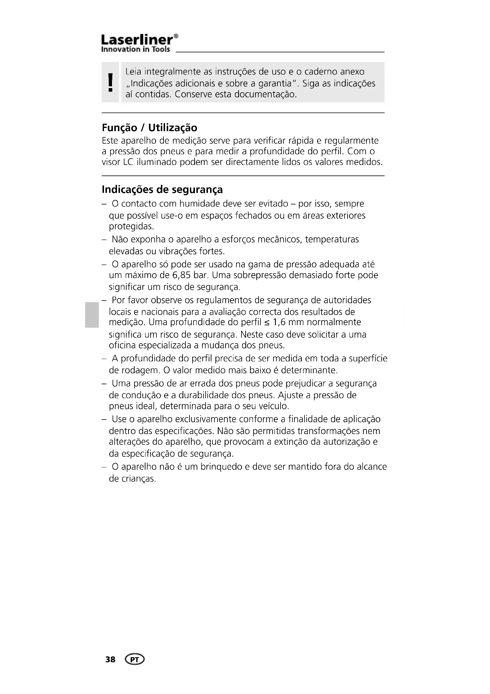 Função / Utilização Este aparelho de medição serve para verificar rápida e regularmente a pressão dos pneus e para medir a profundidade do perfil. Com o visor LC iluminado podem ser directamente lidos os valores medidos. Indicações de segurança – O contacto com humidade deve ser evitado – por isso, sempre que possível use-o em espaços fechados ou em áreas exteriores protegidas. – Não exponha o aparelho a esforços mecânicos, temperaturas elevadas ou vibrações fortes. – O aparelho só pode ser usado na gama de pressão adequada até um máximo de 6,85 bar. Uma sobrepressão demasiado forte pode significar um risco de segurança. – Por favor observe os regulamentos de segurança de autoridades locais e nacionais para a avaliação correcta dos resultados de medição. Uma profundidade do perfil ≤ 1,6 mm normalmente significa um risco de segurança. Neste caso deve solicitar a uma oficina especializada a mudança dos pneus. – A profundidade do perfil precisa de ser medida em toda a superfície de rodagem. O valor medido mais baixo é determinante. – Uma pressão de ar errada dos pneus pode prejudicar a segurança de condução e a durabilidade dos pneus. Ajuste a pressão de pneus ideal, determinada para o seu veículo. – Use o aparelho exclusivamente conforme a finalidade de aplicação dentro das especificações. Não são permitidas transformações nem alterações do aparelho, que provocam a extinção da autorização e da especificação de segurança. – O aparelho não é um brinquedo e deve ser mantido fora do alcance de crianças.TireCheck