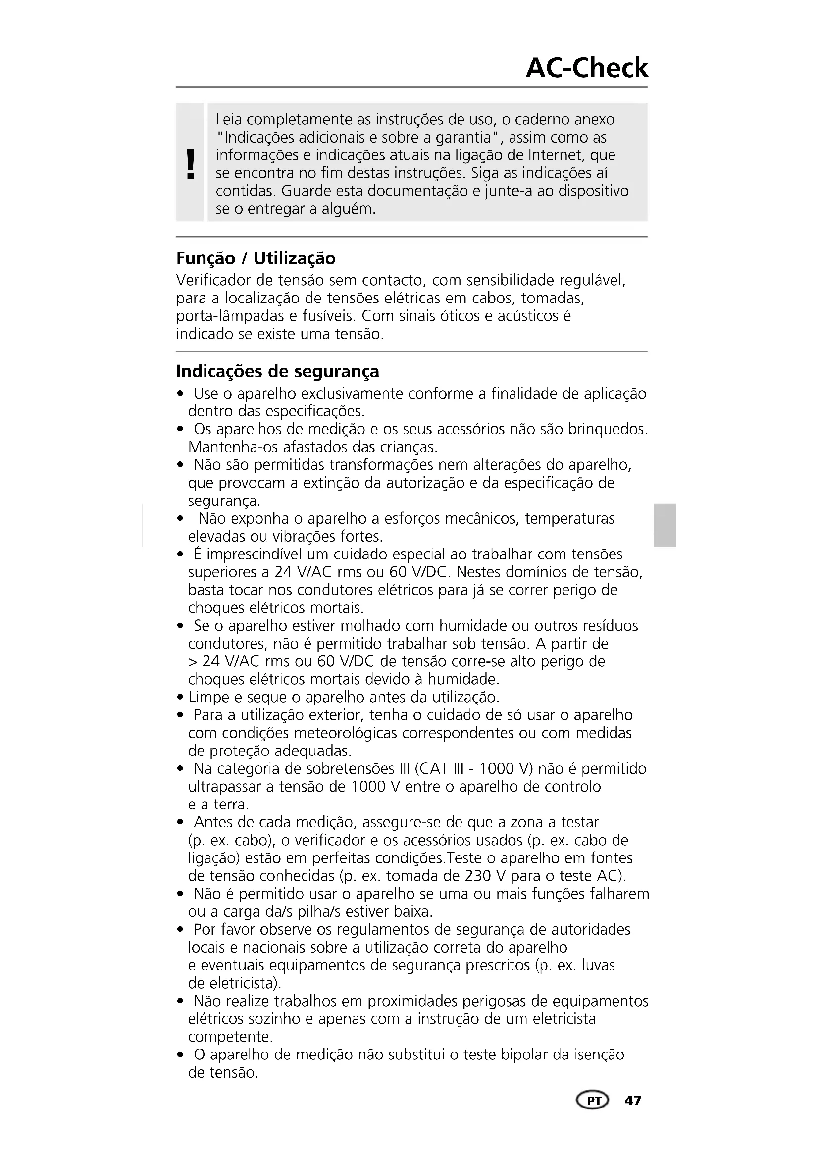 - O aparelho de medição não substitui o teste bipolar da isenção de tensão. PT48