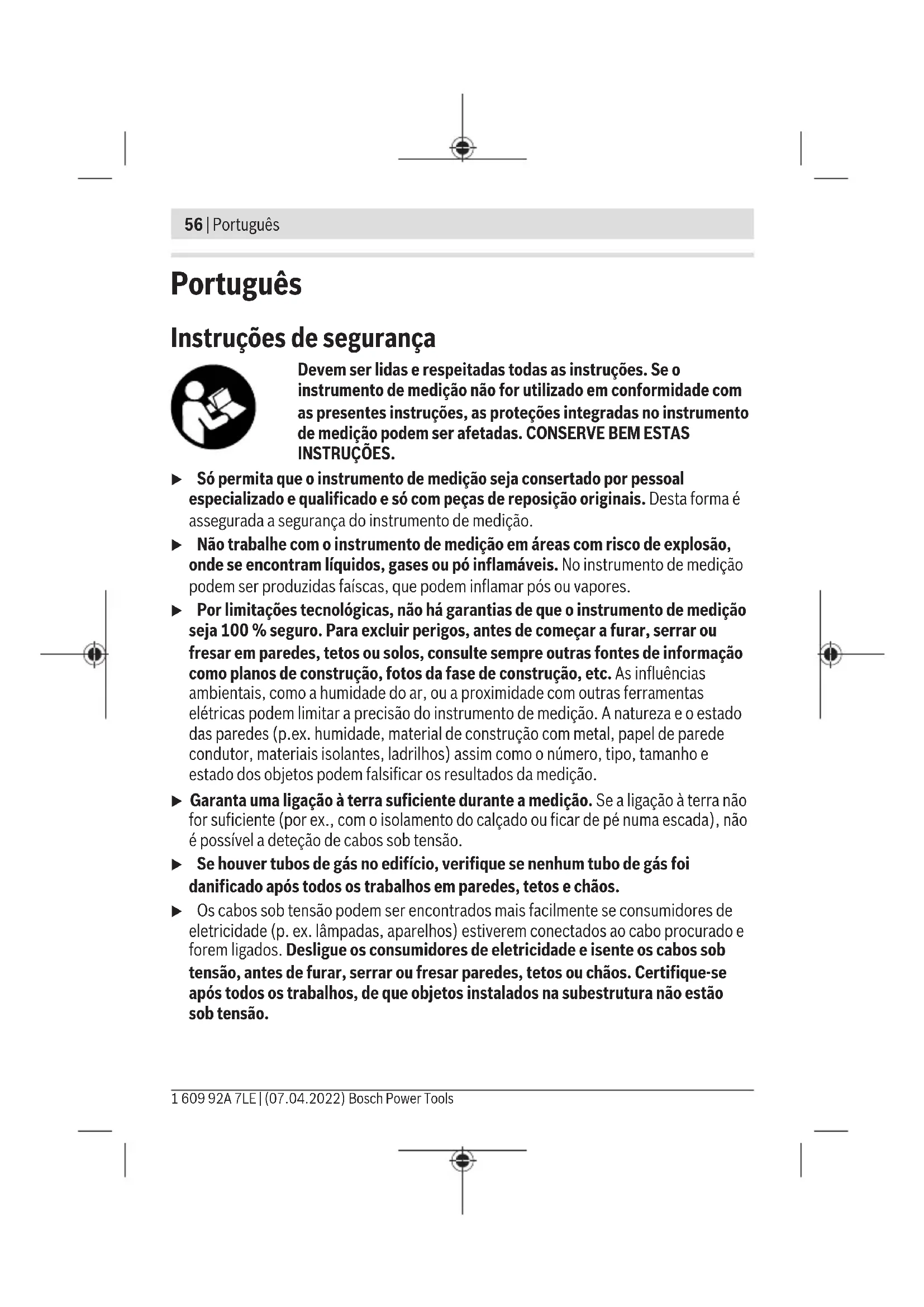 pueda causar su operación no deseada. El símbolo es solamente válido, si también se encuentra sobre la placa de caracte- rísticas del producto/fabricado. Bosch Power Tools 1 609 92A 7LE | (07.04.2022)56 | Português Português Instruções de segurança Devem ser lidas e respeitadas todas as instruções. Se o instrumento de medição não for utilizado em conformidade com as presentes instruções, as proteções integradas no instrumento de medição podem ser afetadas. CONSERVE BEM ESTAS INSTRUÇÕES. u Só permita que o instrumento de medição seja consertado por pessoal especializado e qualificado e só com peças de reposição originais. Desta forma é assegurada a segurança do instrumento de medição. u Não trabalhe com o instrumento de medição em áreas com risco de explosão, onde se encontram líquidos, gases ou pó inflamáveis. No instrumento de medição podem ser produzidas faíscas, que podem inflamar pós ou vapores. u Por limitações tecnológicas, não há garantias de que o instrumento de medição seja 100% seguro. Para excluir perigos, antes de começar a furar, serrar ou fresar em paredes, tetos ou solos, consulte sempre outras fontes de informação como planos de construção, fotos da fase de construção, etc. As influências ambientais, como a humidade do ar, ou a proximidade com outras ferramentas elétricas podem limitar a precisão do instrumento de medição. A natureza e o estado das paredes (p.ex. humidade, material de construção com metal, papel de parede condutor, materiais isolantes, ladrilhos) assim como o número, tipo, tamanho e estado dos objetos podem falsificar os resultados da medição. u Garanta uma ligação à terra suficiente durante a medição. Se a ligação à terra não for suficiente (por ex., com o isolamento do calçado ou ficar de pé numa escada), não é possível a deteção de cabos sob tensão. u Se houver tubos de gás no edifício, verifique se nenhum tubo de gás foi danificado após todos os trabalhos em paredes, tetos e chãos. u Os cabos sob tensão podem ser encontrados mais facilmente se consumidores de eletricidade (p. ex. lâmpadas, aparelhos) estiverem conectados ao cabo procurado e forem ligados. Desligue os consumidores de eletricidade e isente os cabos sob tensão, antes de furar, serrar ou fresar paredes, tetos ou chãos. Certifique-se após todos os trabalhos, de que objetos instalados na subestrutura não estão sob tensão. 1 609 92A 7LE | (07.04.2022) Bosch Power ToolsPortuguês | 57 u Ao fixar os objetos em paredes de materiais pré-fabricados, verifique a capacidade da parede ou dos elementos de fixação, especialmente em fixações na subestrutura. Descrição do produto e do serviço Respeite as figuras na parte da frente do manual de instruções. Utilização adequada O instrumento de medição destina-se à deteção de metais (metais ferrosos e não ferrosos, p.ex. ferros de armação), vigas de madeira e cabos sob tensão em paredes, tetos e soalhos. O instrumento de medição é apropriado para a utilização em interiores e exteriores. Componentes ilustrados A numeração dos componentes ilustrados refere‑se à apresentação do instrumento de medição na página de esquemas. (1) Anel luminoso (2) Abertura de marcação (3) Mostrador (4) Indicação do tipo de funcionamento (5) Tecla de ligar/desligar (6) Tecla da iluminação do display (7) Tecla do sinal acústico (8) Superfície do punho (9) Tecla do modo de operação Cabo elétrico (10) Tecla do modo de operação Metal (11) Tecla do modo de operação Construção a seco (12) Deslizador (13) Área do sensor (14) Número de série (15) Tampa do compartimento das pilhas (16) Travamento da tampa do compartimento das pilhas (17) Encaixe da correia de transporte Bosch Power Tools 1 609 92A 7LE | (07.04.2022)58 | Português (18) Correia de transporte (19) Bolsa de proteção Elementos de indicação (verfiguraA) (a) Indicador de sinal acústico (b) Indicação de aviso (c) Indicação de objetos não metálicos (d) Indicação de metais não magnéticos (e) Indicação de metais magnéticos (f) Indicação de cabos sob tensão (g) Indicação de monitorização da temperatura (h) Indicação da bateria (i) Indicação da medição (j) Escala fina (k) Indicação do centro do objetoCENTER Dados técnicos Detetor digital GMS 120 Número de produto 3601K810.. Profundidade máx. de medição