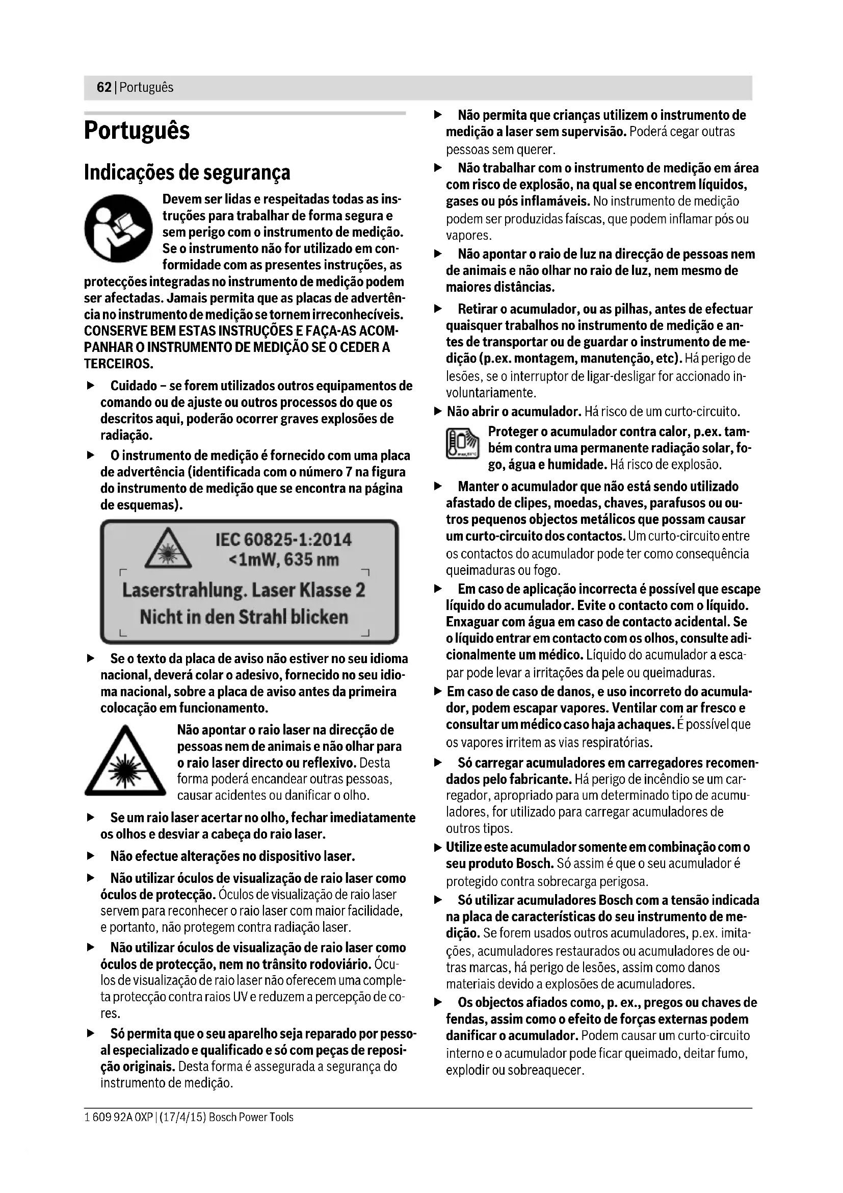 Utilize este acumulador somente em combinação com o seu produto Bosch. Só assim é que o seu acumulador é protegido contra sobrecarga perigosa. Só utilizar acumuladores Bosch com a tensão indicada na placa de características do seu instrumento de me- dição. Se forem usados outros acumuladores, p.ex. imita- ções, acumuladores restaurados ou acumuladores de ou- tras marcas, há perigo de lesões, assim como danos materiais devido a explosões de acumuladores. Os objectos afiados como, p. ex., pregos ou chaves de fendas, assim como o efeito de forças externas podem danificar o acumulador. Podem causar um curto-circuito interno e o acumulador pode ficar queimado, deitar fumo, explodir ou sobreaquecer. OBJ_BUCH-2270-002.book Page 62 Friday, April 17, 2015 9:48 AMPortuguês | 63 Bosch Power Tools 1 609 92A 0XP | (17/4/15) Cuidado! A utilização do instrumento de medição com Bluetooth® pode dar origem a avarias noutros apare- lhos e instalações, aviões e dispositivos médicos (p. ex. pacemakers, aparelhos auditivos). Do mesmo modo, não é possível excluir totalmente danos para pessoas e animais que se encontrem nas proximidades imedia- tas. Não utilize o instrumento de medição com Blue- tooth® na proximidade de dispositivos médicos, postos de abastecimento de combustível, instalações quími- cas, áreas com perigo de explosão e zonas de demoli- ção. Não utilize o instrumento de medição com Blue- tooth® em aviões. Evite a operação prolongada em contacto directo com o corpo. A marca Bluetooth®, tal como o símbolo (logótipo), são marcas comerciais registadas e propriedade da Bluetooth SIG, Inc. Qualquer utilização desta marca/des- te símbolo por parte da Robert Bosch GmbH possui a devi- da autorização. Descrição do produto e da potência Abrir a página basculante contendo a apresentação do instru- mento de medição, e deixar esta página aberta enquanto esti- ver lendo a instrução de serviço. Utilização conforme as disposições O instrumento de medição destina-se à medição sem contac- to da temperatura de superfícies, da temperatura ambiente e da humidade relativa. O instrumento calcula a temperatura do ponto de orvalho e alerta para as pontes de calor e o perigo de formação de bolor. Com o instrumento de medição não é pos- sível detectar manchas de bolor. Contudo, pode ajudar a de- tectar atempadamente condições que favorecem a formação de manchas de bolor. O instrumento de medição não pode ser usado para medir a temperatura em pessoas ou em animais, ou para outros fins médicos. O instrumento de medição não é adequado para a medição da temperatura de superfície de gases. A medição da temperatu- ra de líquidos só é possível exclusivamente com a ajuda de um termómetro convencional (tipo de conexão K), que pode ser ligado ao instrumento de medição através da interface previs- ta para o efeito 25. A luz deste instrumento de medição serve para iluminar a área de trabalho directa do instrumento de medição para efeitos de gravação de imagens. Não é adequada para a iluminação ambiente no âmbito doméstico. Os pontos laser não podem ser usados como apontador laser. Servem exclusivamente para marcação da área de medição. Componentes ilustrados A numeração dos componentes ilustrados refere-se à apre- sentação do instrumento de medição na página de esquemas. 1 Cobertura da tomada/conexão para micro USB do ter- mómetro (Tipo K) 2 Abertura para saída do raio laser 3 Tecla de desbloqueio para acumulador/adaptador de pilhas/tampa do compartimento das pilhas 4 Tecla Medir/tecla Ligar 5 Sensor da humidade do ar e da temperatura ambiente 6 Número de série 7 Placa de advertência laser 8 Micro cabo USB 9 Tecla Guardar/enviar via Blue tooth® 10 Tecla de função direita 11 Tecla de seta direita 12 Tecla de ligar-desligar 13 Tecla de seta para baixo/reduzir o nível de ampliação 14 Tecla de ligar/desligar a luz 15 Tecla de seta esquerda 16 Tecla de seta para cima/aumentar o nível de ampliação 17 Tecla de função esquerda 18 Display 19 Capa de protecção do sensor da humidade do ar e da temperatura ambiente 20 Fixação da alça de transporte 21 Capa de protecção da lente receptora de infravermelhos 22 Câmara 23 Lente receptora da radiação infra-vermelha 24 Luz 25 Conexão tipo K para o termómetro 26 Tomada para micro USB 27 Invólucro do adaptador de pilhas 28 Tampa de fecho para adaptador de pilhas 29 Compartimento para o acumulador 30 Acumulador* 31 Tampa do compartimento da pilha