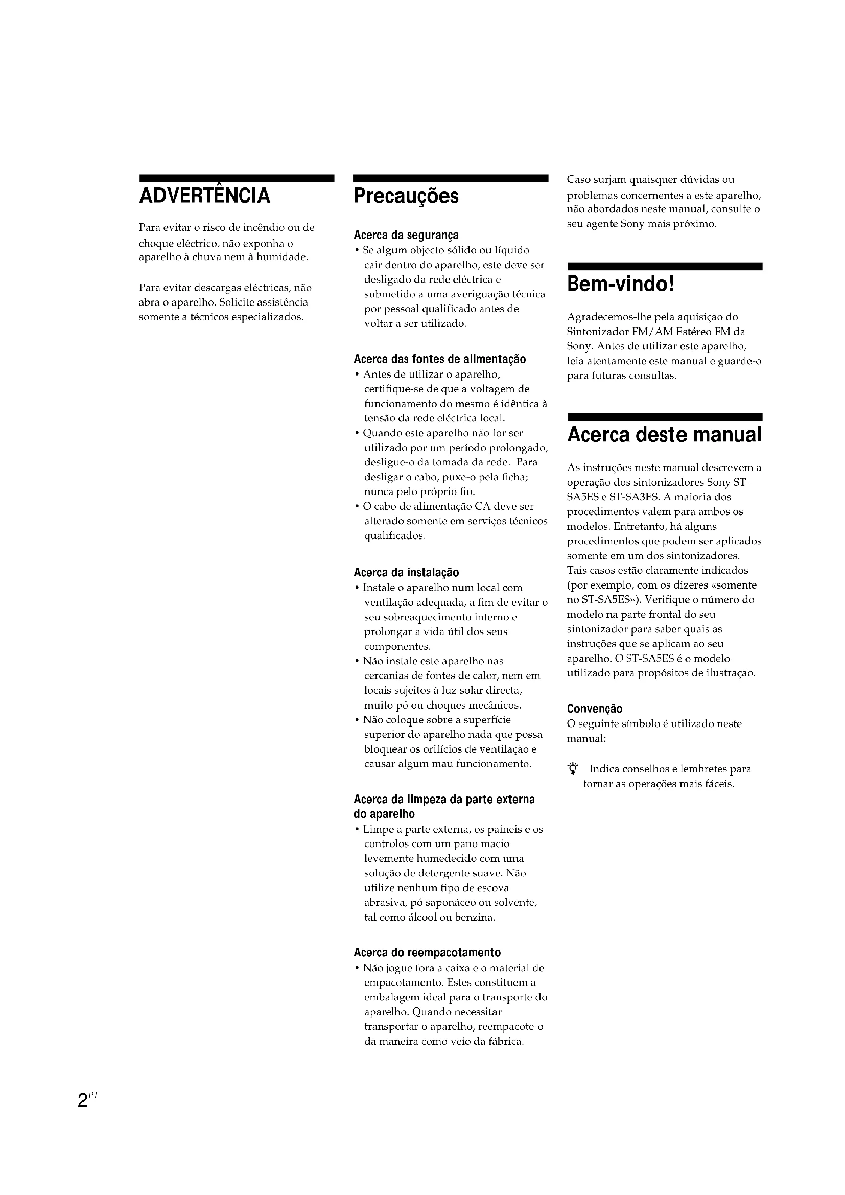 - Não jogue fora a caixa e o material de empacotamento. Estes constituem a embalagem ideal para o transporte do aparelho. Quando necessitar transportar o aparelho, reempacote-o da maneira como veio da fábrica. Caso surjam quaisquer dúvidas ou problemas concernentes a este aparelho, não abordados neste manual, consulte o seu agente Sony mais próximo. Bem-vindo! Agradecemos-lhe pela aquisição do Sintonizador FM/AM Estéreo FM da Sony. Antes de utilizar este aparelho, leia atentamente este manual e guarde-o para futuras consultas. Acerca deste manual As instruções neste manual descrevem a operação dos sintonizadores Sony ST- SA5ES e ST-SA3ES. A maioria dos procedimentos valem para ambos os modelos. Entretanto, há alguns procedimentos que podem ser aplicados somente em um dos sintonizadores. Tais casos estão claramente indicados (por exemplo, com os dizeres «somente no ST-SA5ES»). Verifique o número do modelo na parte frontal do seu sintonizador para saber quais as instruções que se aplicam ao seu aparelho. O ST-SA5ES é o modelo utilizado para propósitos de ilustração. Convenção O seguinte símbolo é utilizado neste manual: z Indica conselhos e lembretes para tornar as operações mais fáceis.3